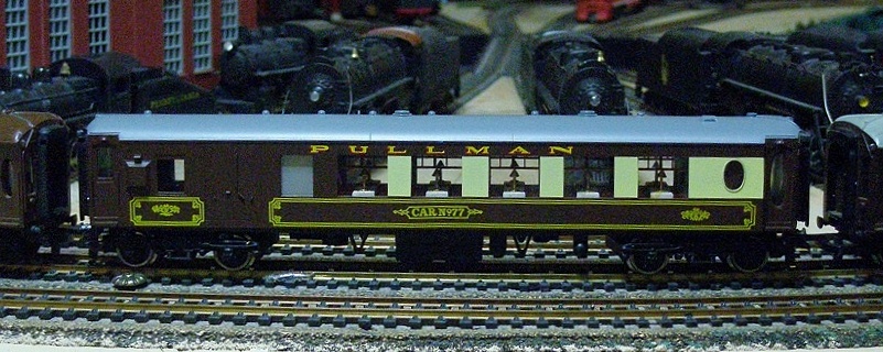Here is 1 of 4 passenger cars transfered over fron the PGW, Catford branch. They are neat because of the interiors and lettering that they have. Thy are all lettered for the Pullman company. Something I was not aware of existing untill the first set of simillar trains arrived. The other thing is the interiors and the way each compartment has its own table and benches. Each table has it's own lamp. frank toptrain
