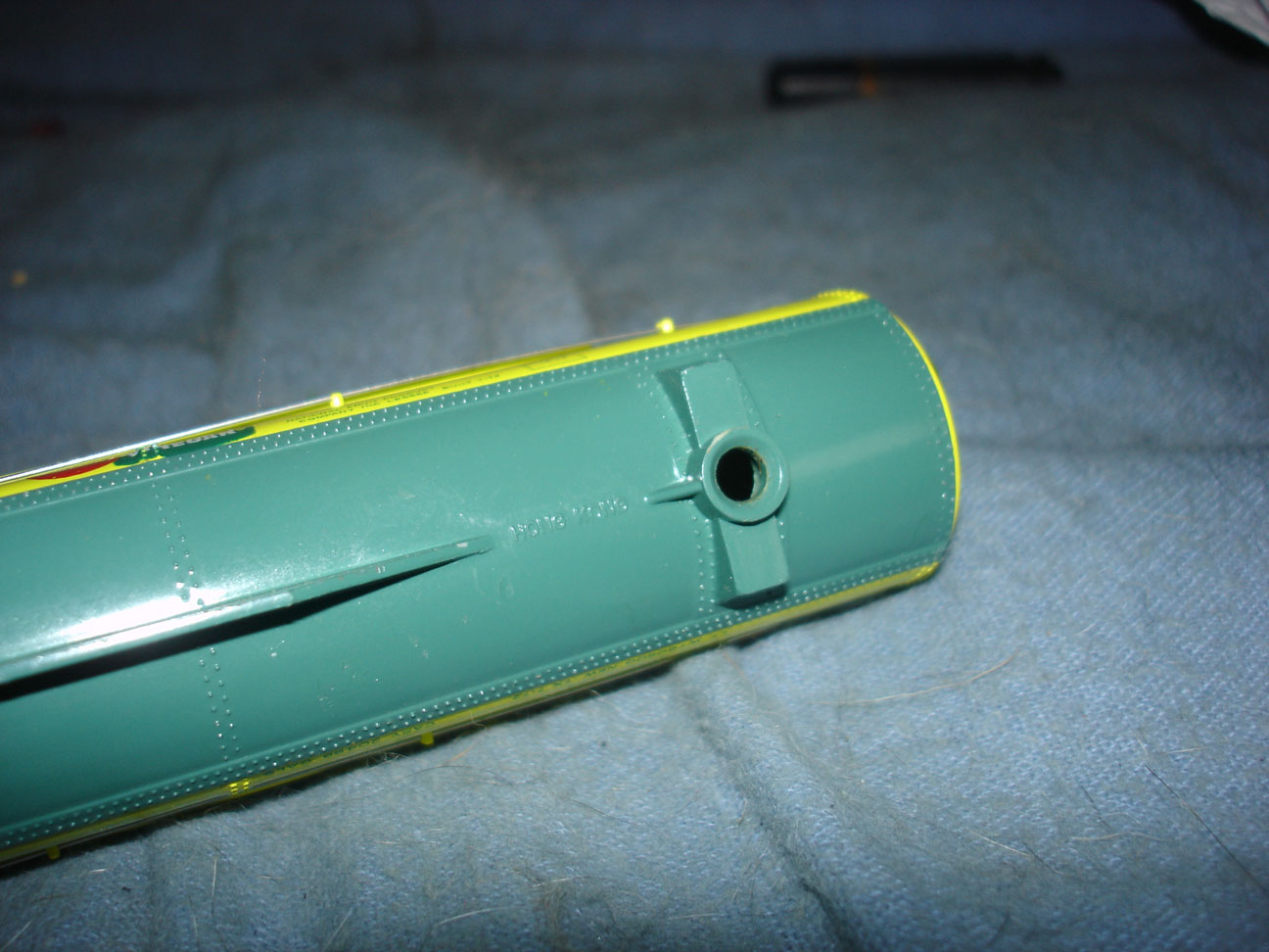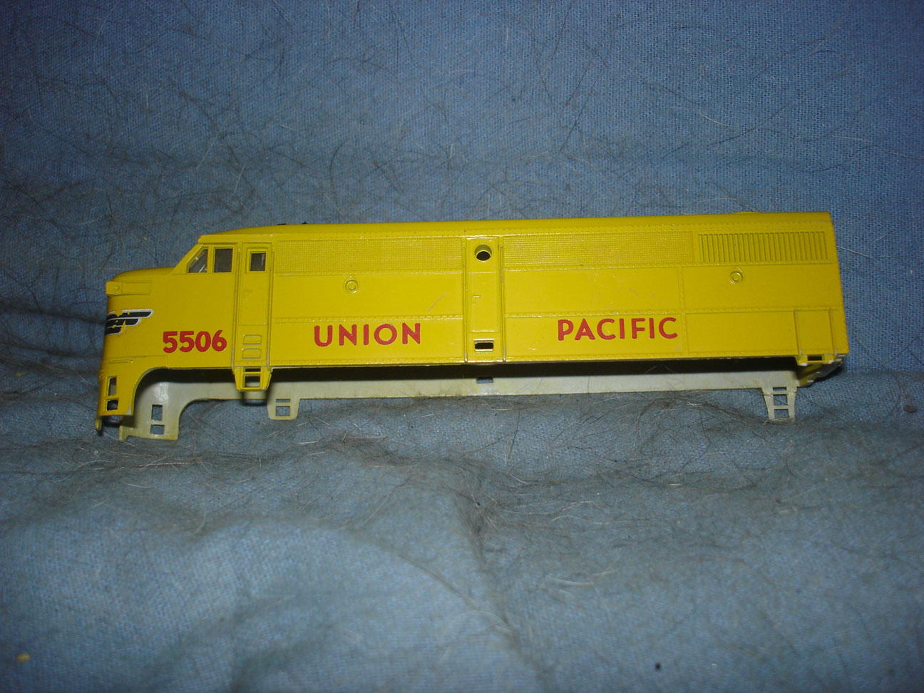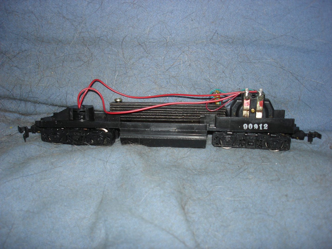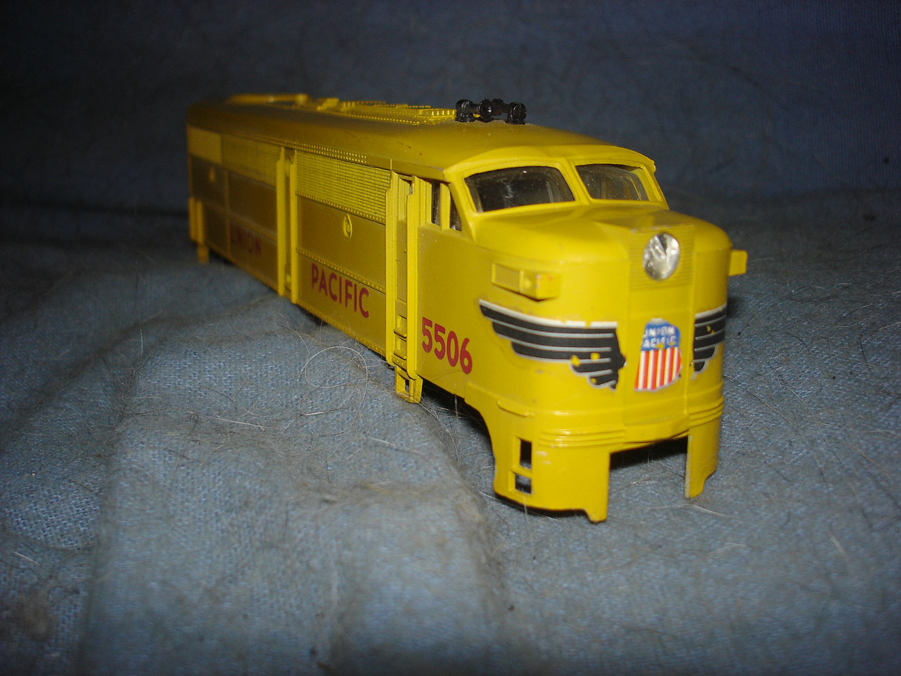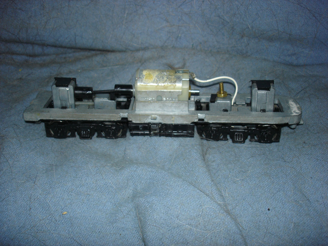 Next, a Union Pacific Alco FA by Lionel. The shell is missing one rear step and also the front decal has parts flaked off. I worked on the chassis and it runs now but I had to secure both truck pans with screw/bolts because one plastic tab was broken on each. No couplers installed. No light. One plastic drive wheel has a portion of the flange broken. In short, it runs OK for now, but maybe you should think of it as a dummy.