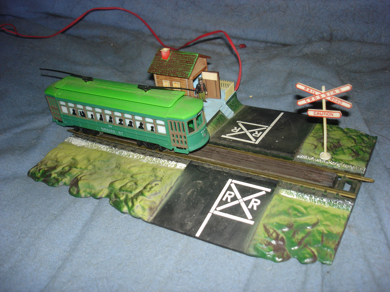 I found one of the crossbucks that go with the crossing shanty accessory so am offering it up. The light works and the crossing guy pops out whenever something goes over the track. Cannot find the other crossbuck.