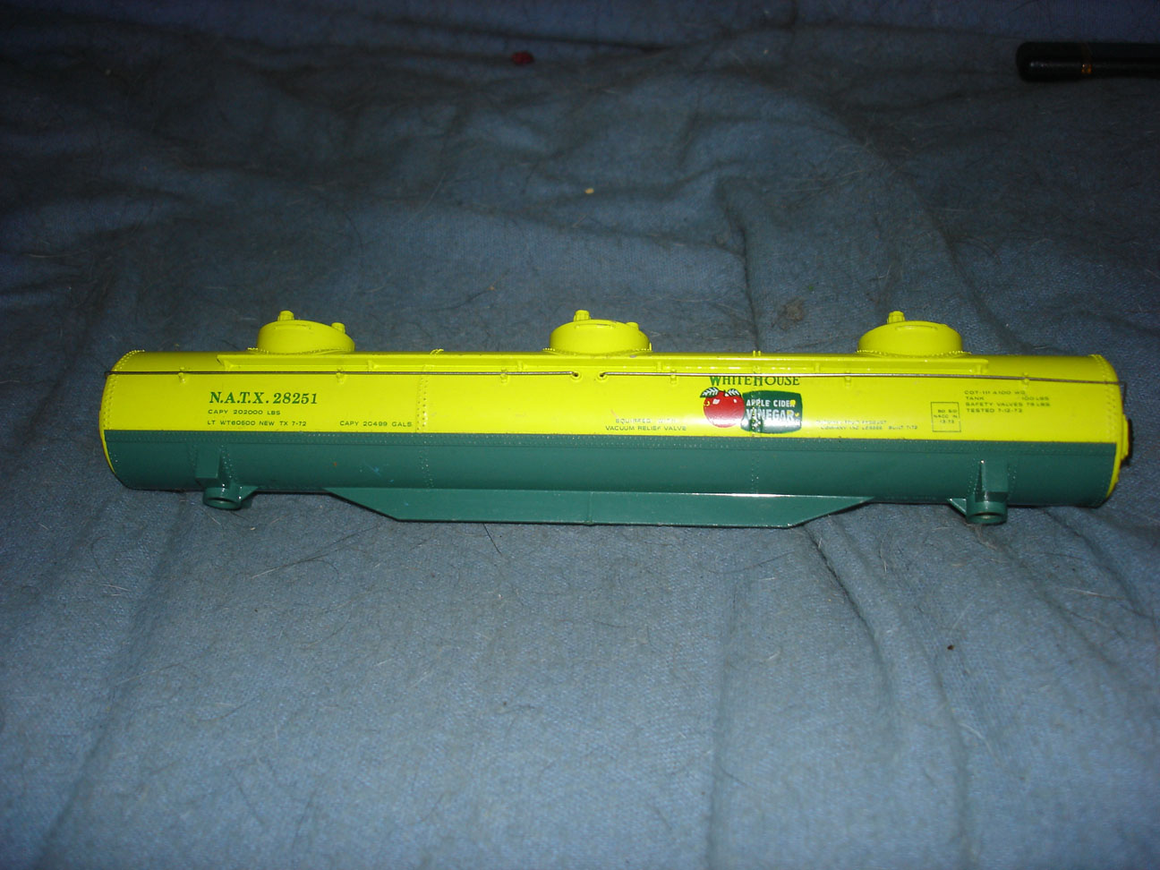 Finally, this 60' Bachmann 3-dome tanker has a few stray paint blobs but otherwise presentable. It is labeled White House Apple Cider Vinegar. If you put regular trucks on it, it doesn't seem like it would work well. I think it needs trucks with a longer coupler, like some caboose trucks.