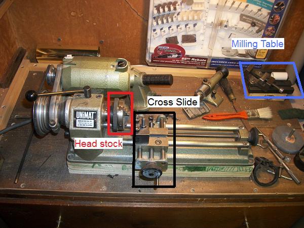 Jerry, I took an existing picture I had of my Unimat, and edited it to show different parts in the picture.... if you look behind the motor, you can see the headstock column, this is what makes your Unimat in the "Drill Press" state, as you'll see in my picture its in the "Metal Lathe" state......I want ot get pictures of mine added so that it can be seen in different set ups!