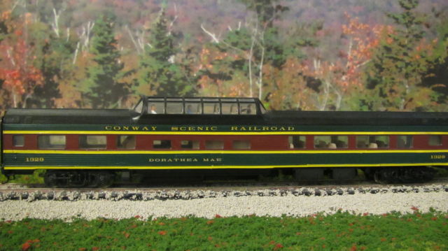 My car of the week is a custom painted Walthers dome car that represents the Dorthea Mae at the Conway Scenic Railroad in North Conway New Hampshire.