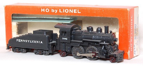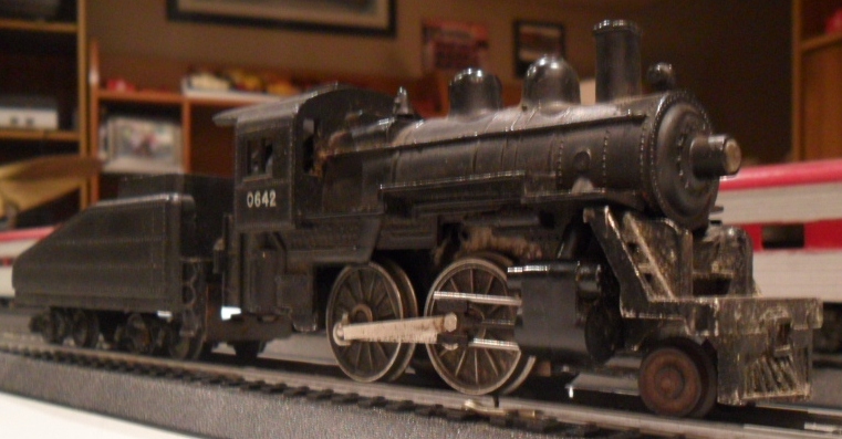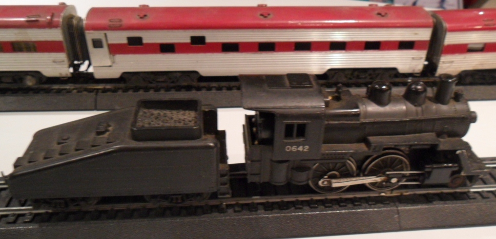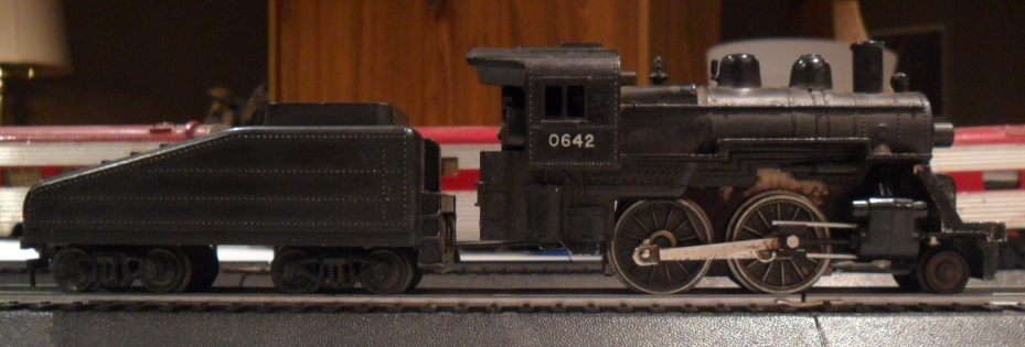 | The 0642 switcher is a Lionel HO piece, made 1961-1962; it's missing a trailing truck as it should be a 2-4-2 and uses the old Hobbyline switcher body on a new chassis sharing drive wheels with the Lionel (former English) 4-6-2. It's nicknamed the "haybird" -