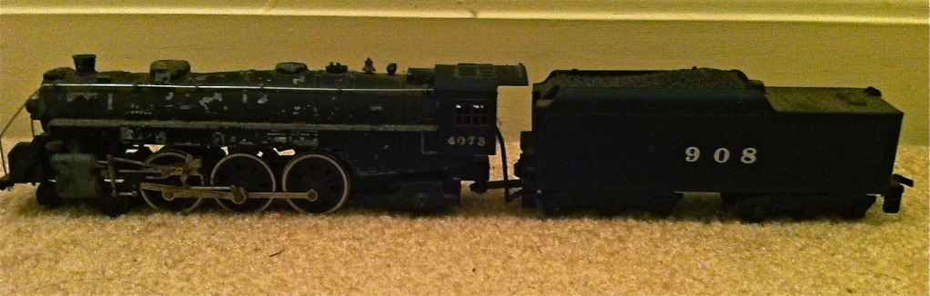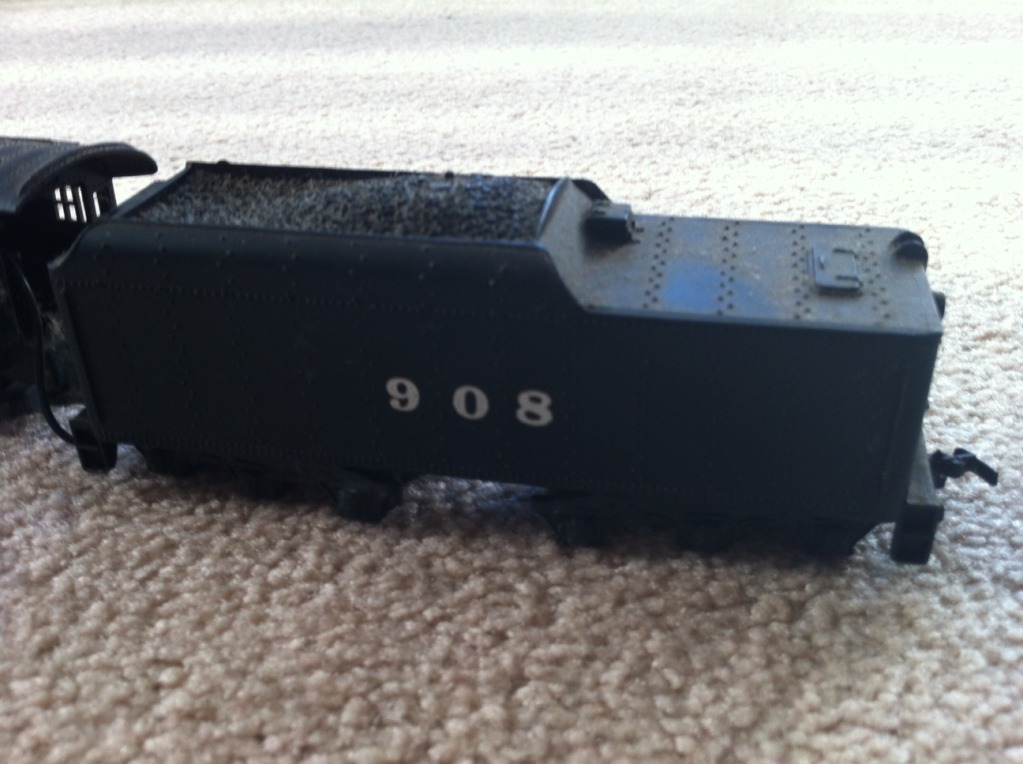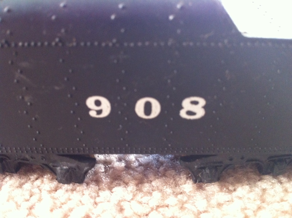 | I have found that some of that lettering is pretty easy to remove. Is it possible the tender was deco'd on the other side at one point? Still, I don't know that I've seen a "908" tender before, which makes it interesting in any side. Er, I mean "case".
