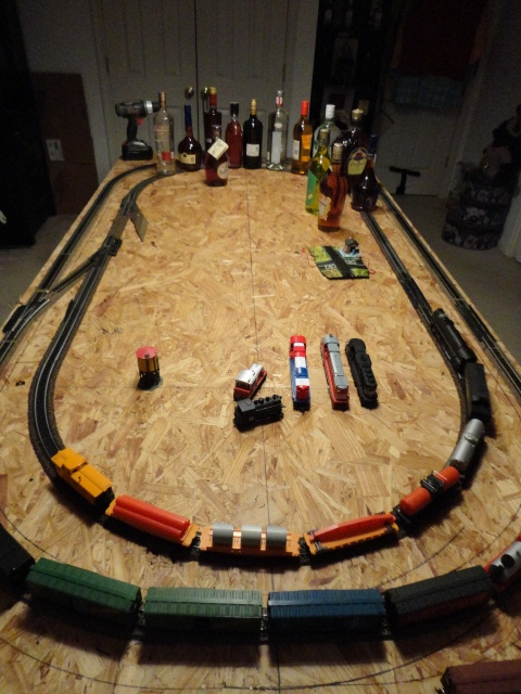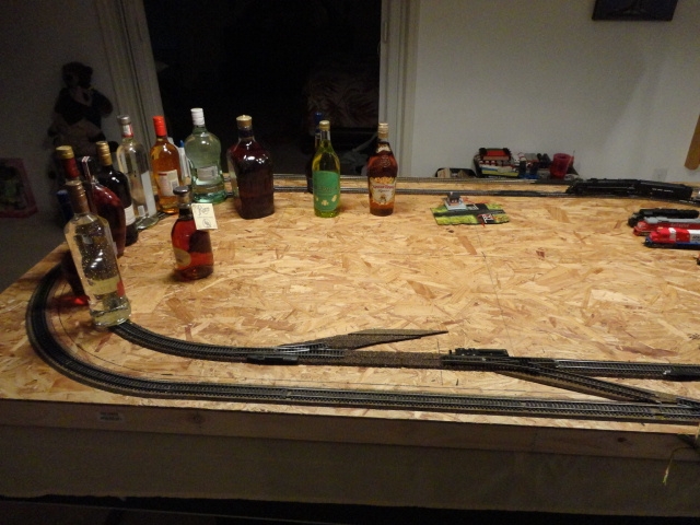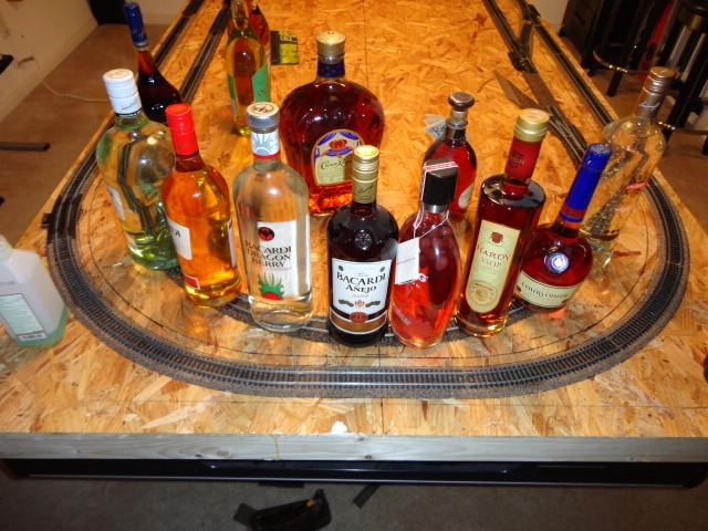 I'm sorry, but I had to laugh at the line of alcohol bottles. It always amuses me to see what people use as weights when gluing track. I've used/seen people use everything from paint bottles to driveway pavers