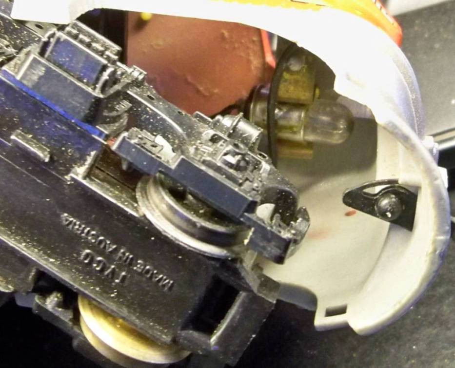 This photo shows the wires to the plastic MU motor truck. The larger wire toward the front (of the photo) goes to a wiper that picks up power from the axles of the motor truck. The smaller wire soldered to that same terminal goes to the headlight bracket. The wire toward the back of the photo goes to the axle wiper in the front truck. There is a smaller wire coming from the front truck that goes to the light bulb also. Hope the photos can help with wiring this type locomotive.