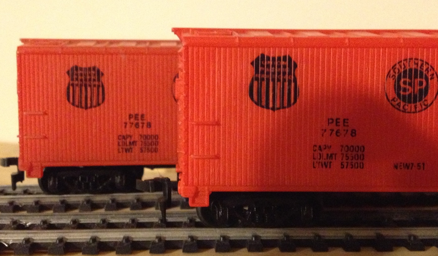 Today, at an antique mall in Mooresville NC I found a second example of a Tyco Pacific Fruit Express reefer with PEE reporting marks! Here's a pic of the two of them side by side. I hope the focus is good enough to read both cars: