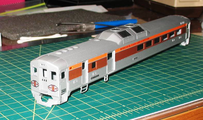 Next up, I had no way to repair the damage, so I removed all the Alclad and rethought the painting scheme for the RDC. I then used my Minnesota, Sioux Lake & Western colors to run horizontal color bands along the top of each car side, then masked those colors and sprayed the remained of the shell with Rustoleum Matte Nickel, which was significantly less "shiny" than an aluminim color and also less shiny than the Alclad (perhaps a bit more realistic, in my opinion).