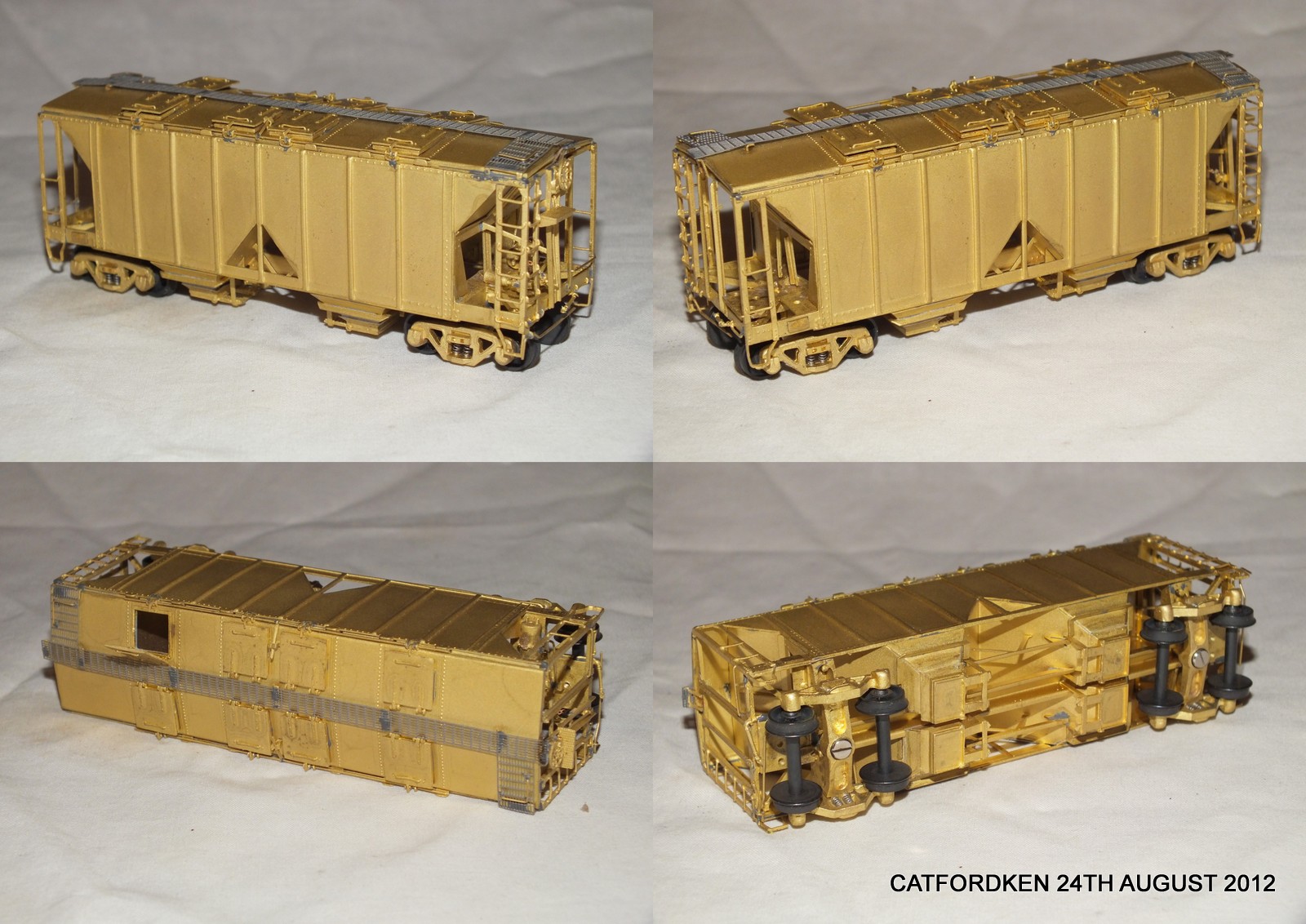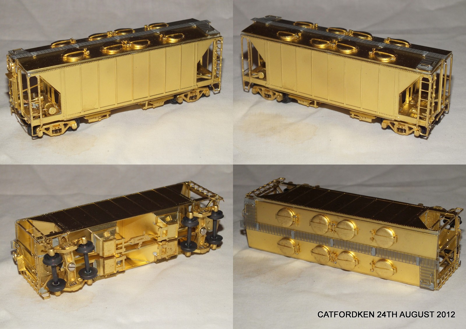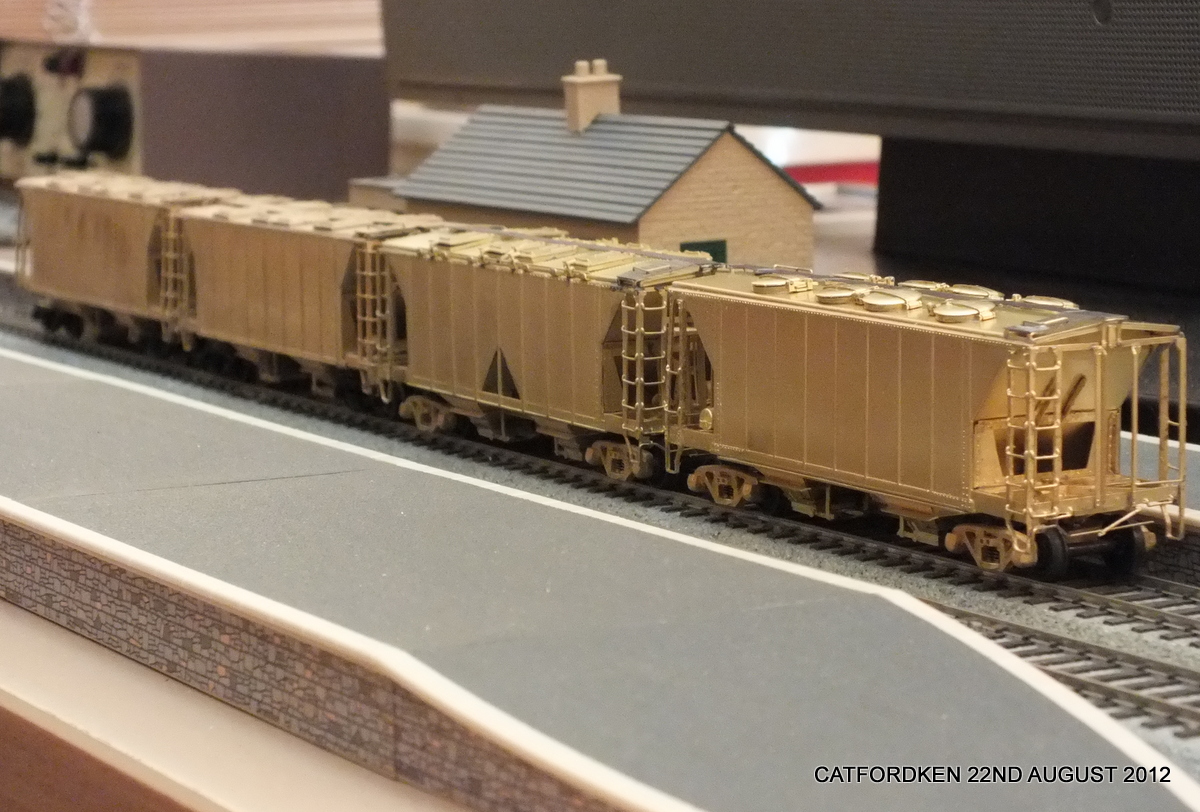 a nice rake consisting of from front to rear 1 pecos river acf 34" covered hopper closed side/round hatches (rebuilt) 2 pecos river acf 34" covered hopper closed side-single handle hatches 3/4 ps2 34" covered hoppers