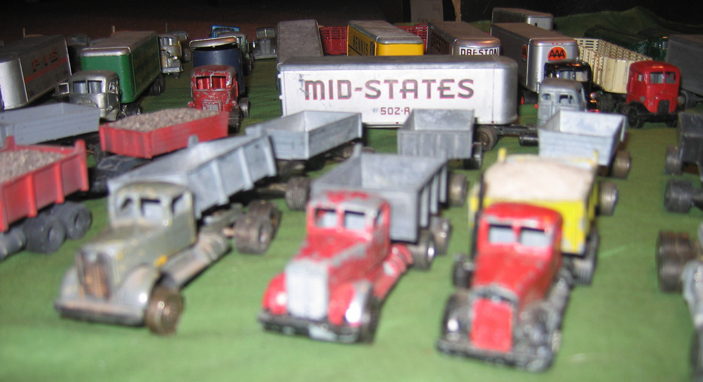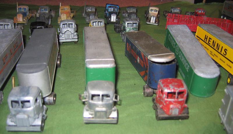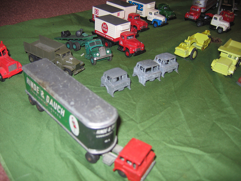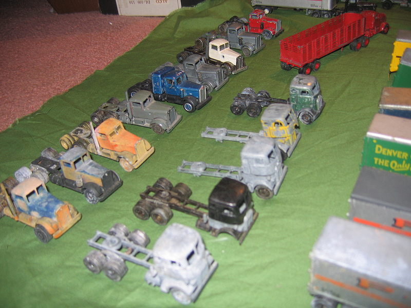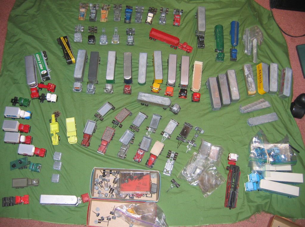 Goodmorning Sean ; * Very Interesting ! A Few Penn Line, and lots of Ulrich. Then some odds and ends. Ulrich printed, As well as run of the mill road names, there are some interesting names on the sides of their trailers. Could you lay them on their sides and show us some of what is printed there. * As to restoring them. They came from the factory with painted and unpainted cabs. The trailer roofs and floors, were unpainted. Very few came factory finished. The sides mostly covered with 1920s to 1940s art work. If restoring, cleaning up the unpainted castings. Wrapping the painted parts in new tissue paper. Then cleaning out the dust from the boxes and repacking. This is quicker and easier to do. * If you meant finishing the assembly, and giving them period paint, you got a lot of work there. * Good luck with your endeavors. May it all go smoothly.