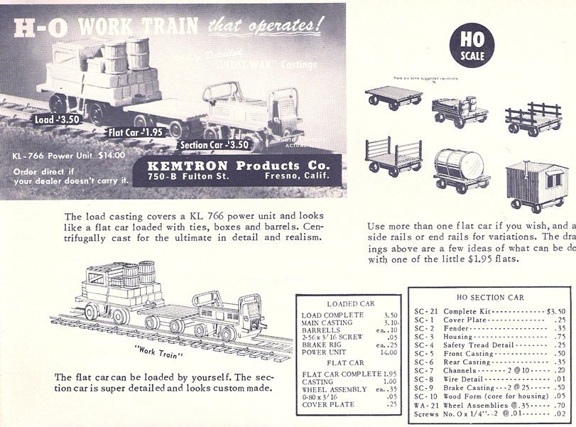 This is my AOTW. It is a Kemtron Work Train. I picked the set up this weekend. The powered unit is not here. I have one packed away in storage, along with several other carts. The powered unit is shown in the Kemtron catalog pic below. It is the one with the heavy load casting. I think it has a small Lindsay motor unit if I am remembering correctly.