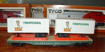 I like to buy Ebay lots that has one or more pieces that I want in them. Photo is part of a lot I bought a couple of weeks back. I had a pair of Tropicana trailers that were slightly aged in color that I wanted to replace. The pictured Tropicana flat was on ebay with an engine, Caboose, and a boxed Tyco Colonial Home with a pack of telephone poles. Auction never sold and I contacted seller who offered me the lot for $30 shipping included. I sold my aged Trailer pair (not on Flat Car) on ebay for $15.50.. the engine & caboose sold for $6, The colonial Home for $5 totaling $26.50.. I ended up with a new crisp colored flat car with trailers in the box, for only $3.50