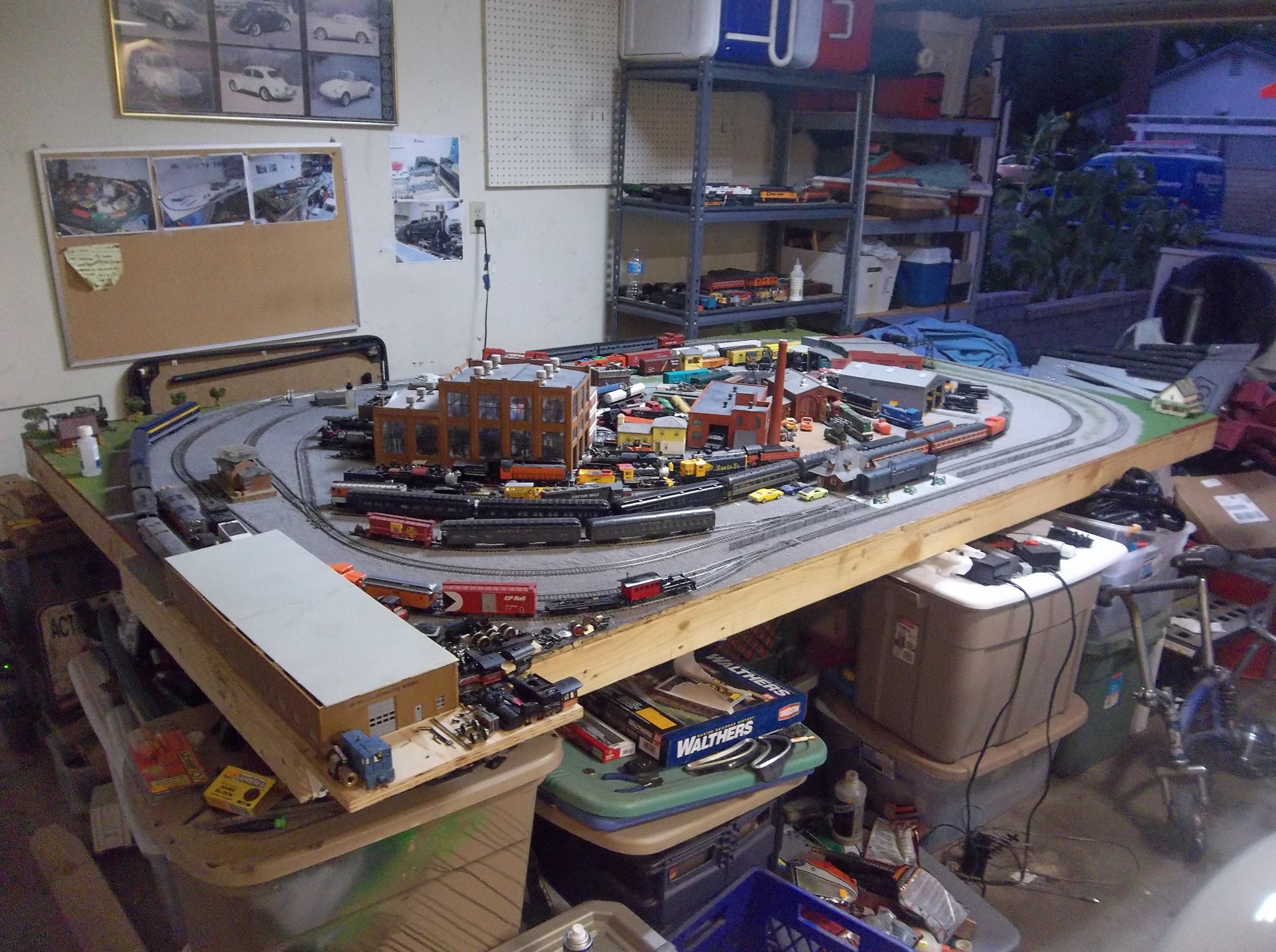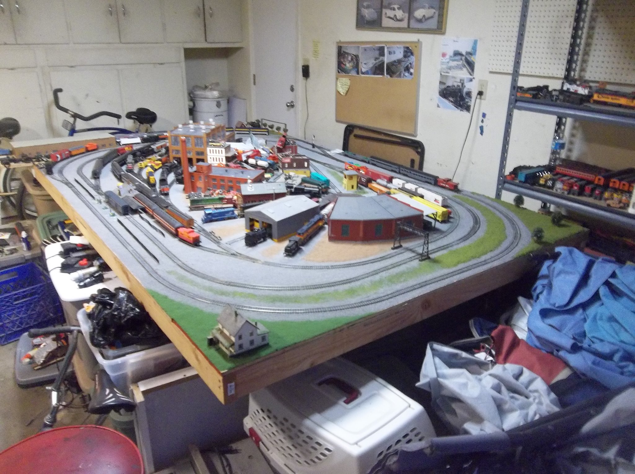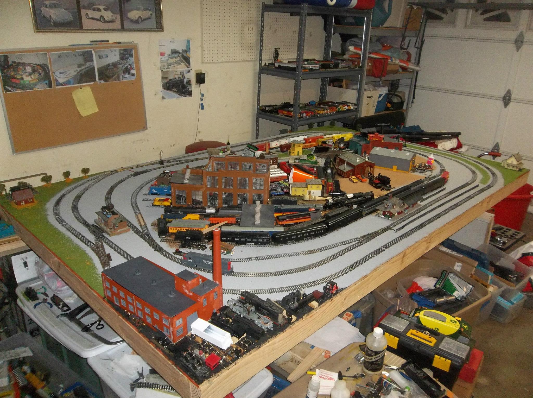 An idea I've had to keep a layout from getting dusty when not use, is a removable cover. Imagine a rectangular frame the size of the layout with 4 legs. The frame could be sheeted with plastic or a drop cloth. The 4 legs(or 6 if needed) would fit into receiver pockets on the outside frame of the layout. The sheet would cover the removable frame and hang down slightly below the layout frame. I know it would be cumbersome to lift off and install because of it's large size. However, in SCVR's case, it could be susupended from the garage ceiling with a cable and pulley system.