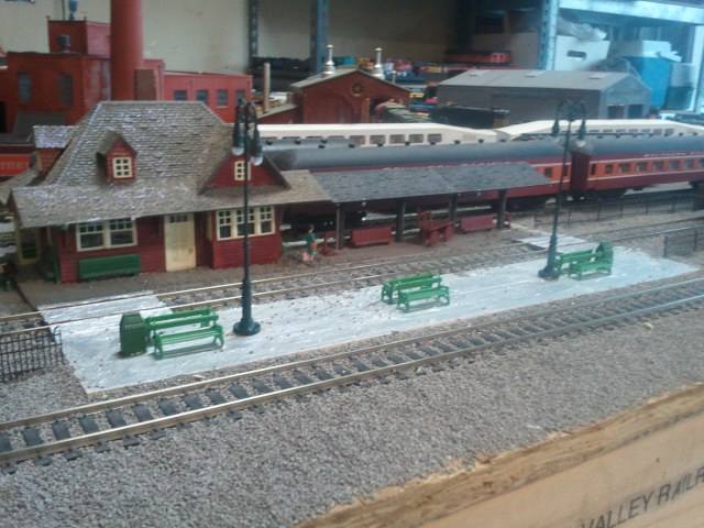 one of my favorite spots on the layout is the new station area I built myself. The platforms are cut to size home depot paint sticks, painted silver, the 2 lights are Walthers cornerstone and yes are hooked up and work. Benches are model power, and I built the walk ways myself out of wood grade crossings.