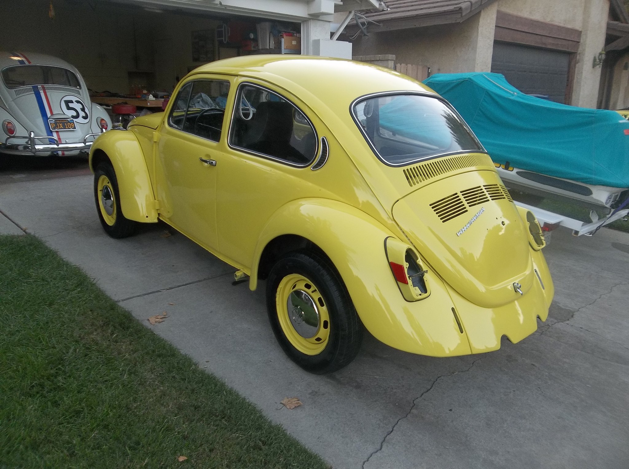 it looks like this!! Body is all straight and smooth now. Sports a new coat of bright, light yellow. I didn't want a painfully bright yellow, I wanted a sleek, light, but still moderately bright, yellow. Looks fantastic now and so far I've got the door handles, VW emblems, side view mirror, decklid handle, tail lights installed minus the lens's, turn signal lights installed, caps in the trunk, and all the new clips that hold the chrome pieces onto the body. The engine is still out but now that it's home, work on reassembling the engine is in full force!