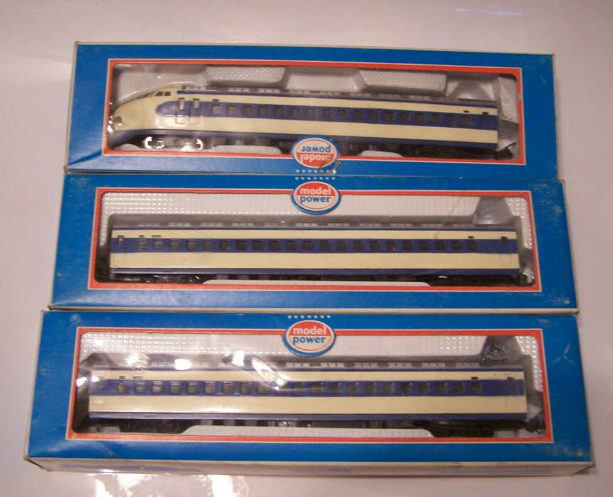 A vendor right across from my club's layout at TImonium had these Model Power / Playart Shinkansen turbo train. I've got an Amtrak set of these, now I got the white and blue complete set. There's a Coke set as well by Playart. I don't think they are very high quality, but I liked the looks of them, and at $5 apiece, a decent deal.