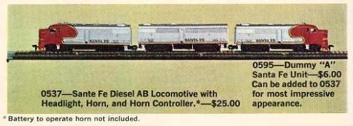 quote:What you have is a frame with horn for the Santa Fe 0535 Alco B unit. It was cataloged from 1962 thru 1966.