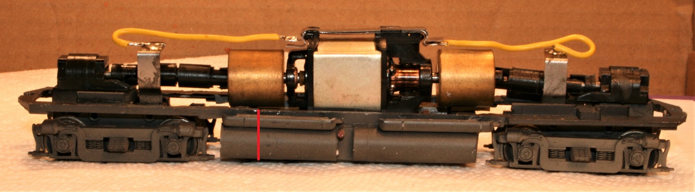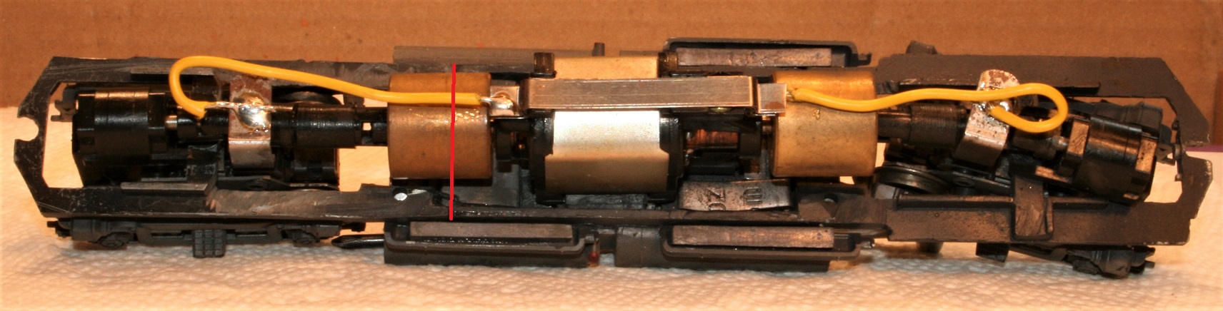 The chassis is basically an Athearn 4 axle GE "U-Boat" mechanism lengthened by one scale foot. This was done by splicing two U-Boat frames together adding one scale foot in the fuel tank area, the red line shows where the two frames were epoxied together. Note that I needed to lengthen the drive line between the front truck's gear tower and the flywheel to accommodate the stretched chassis. A manufacturer called "A Line" makes an Athearn Universal Coupling Assortment kit that provides the parts for this modification.