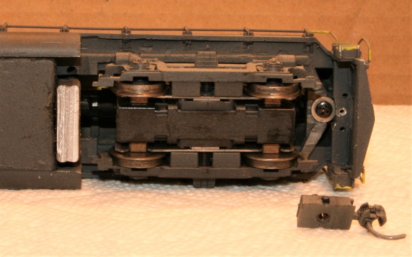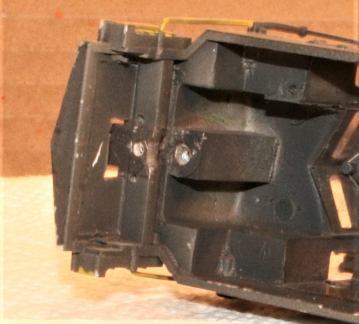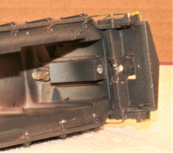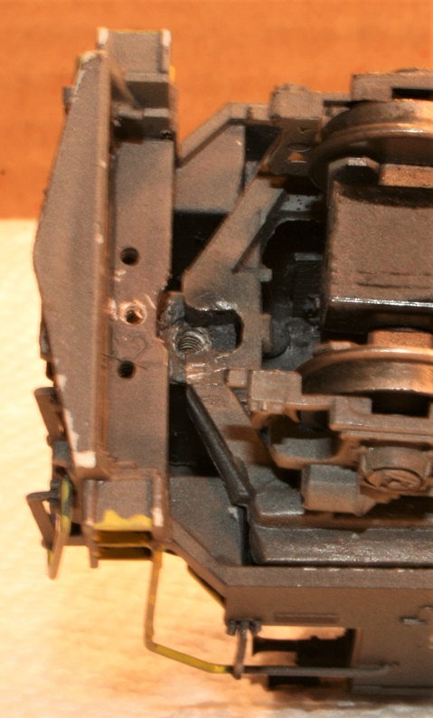 Note how I used styrene plastic to fill in the pilot and provide a place to mount the Kadee coupler pockets.