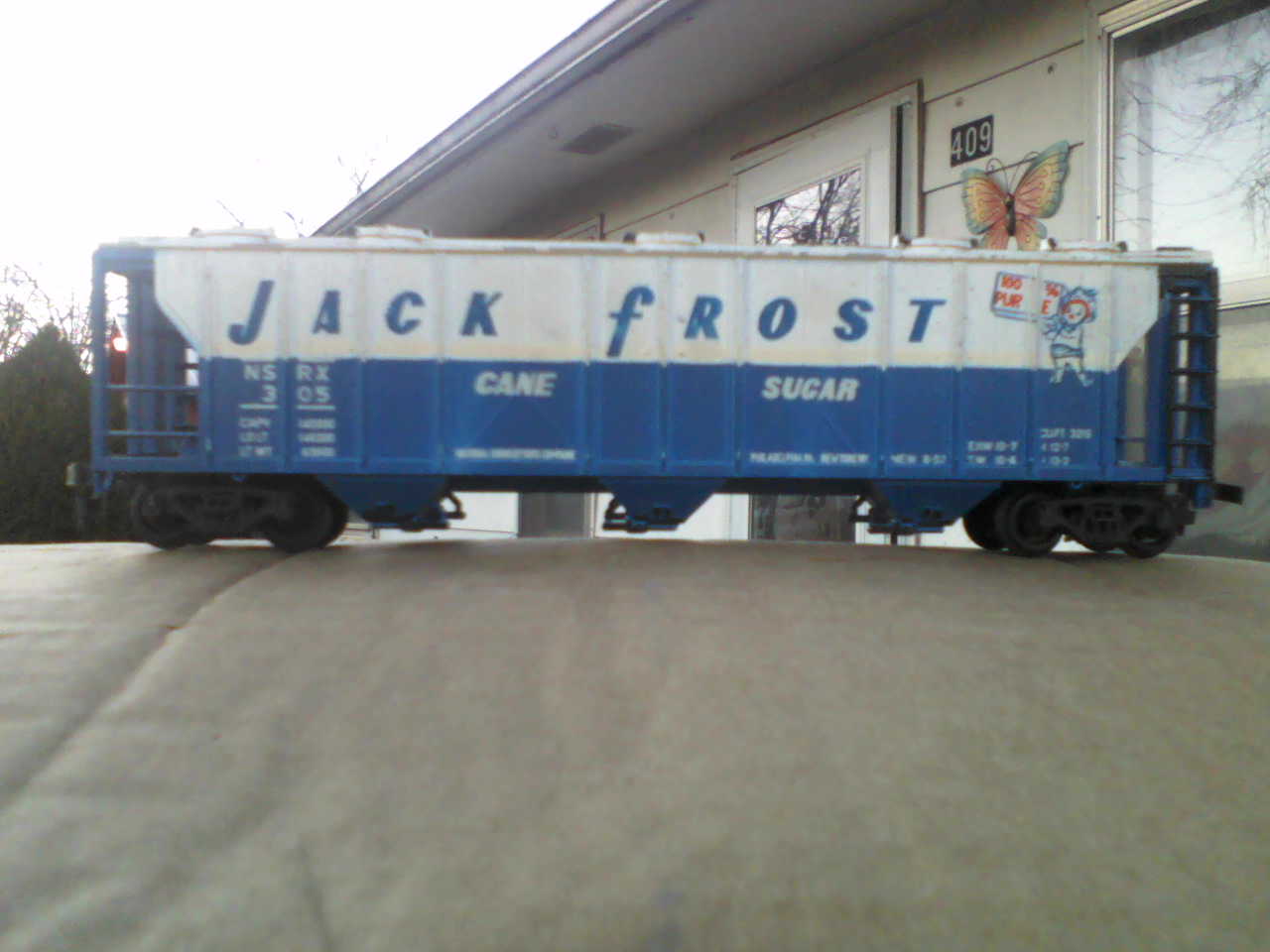 All metal Ulrich hopper from my operating coal ramp. Just needs a matched pair of trucks. Interesting how it works and looks like a normal 3 bay hopper. That chalkin' marks are factory and add a nice detail!