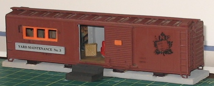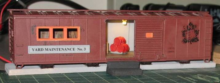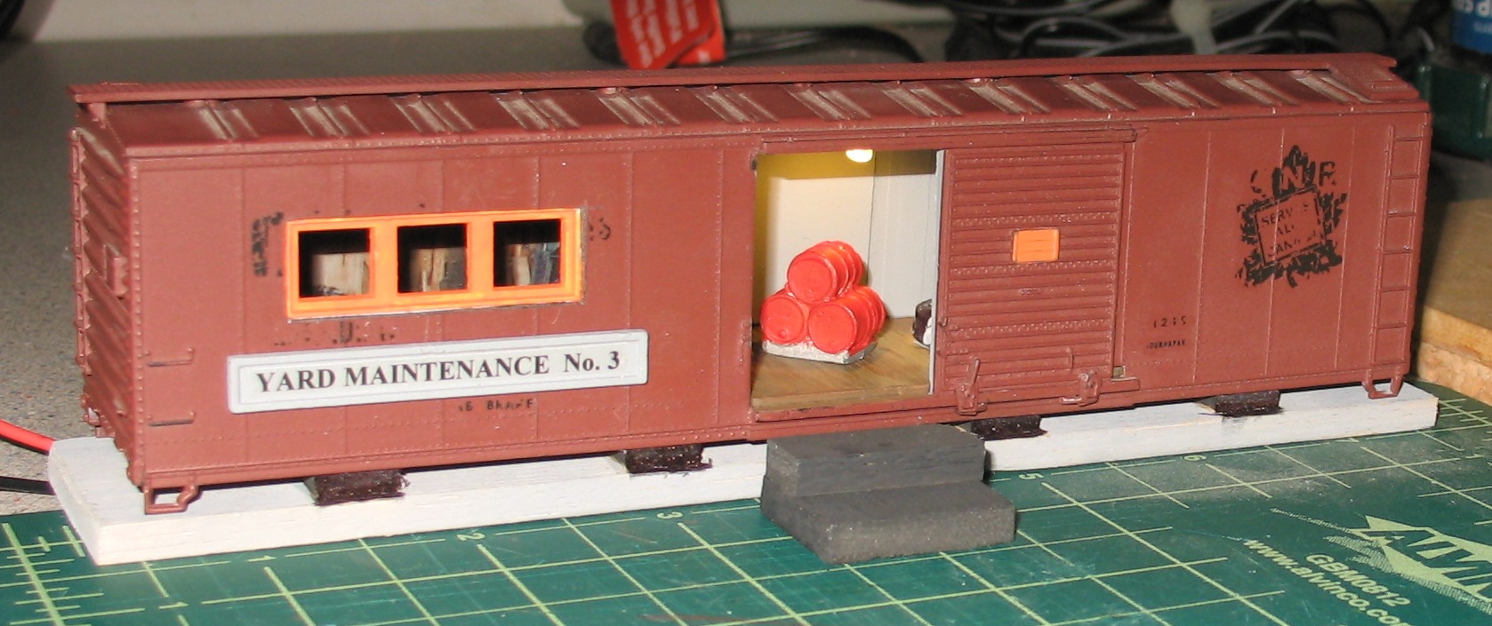 The underframe was discarded into my parts box, and I then weathered the interior floor with Model Master wood and Polly S depot brown. After that, I glued some objects to the floor. I made an adhesive label photo image of some tools and placed that on the rear wall opposite the windows- to suggest tool storage. I then wired a single overhead 3mm flat LED with a 470 ohm resistor and placed it in the center ceiling. The inside wires were run thru a square styrene channel and out thru the bottom of the floor on the rear side of the car and down thru the pad base.