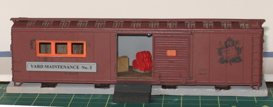 I had this 50 ft Canadian National box car that had no trucks and wheels, which I had picked up at a long ago flea market. Rather than spend $ to get it rolling, I decided to convert it into a freight yard shed, as the lettering/decaling had deteriorated and it already looked forlorn.