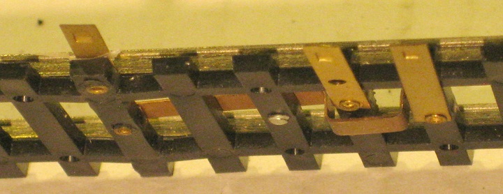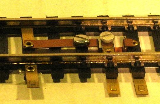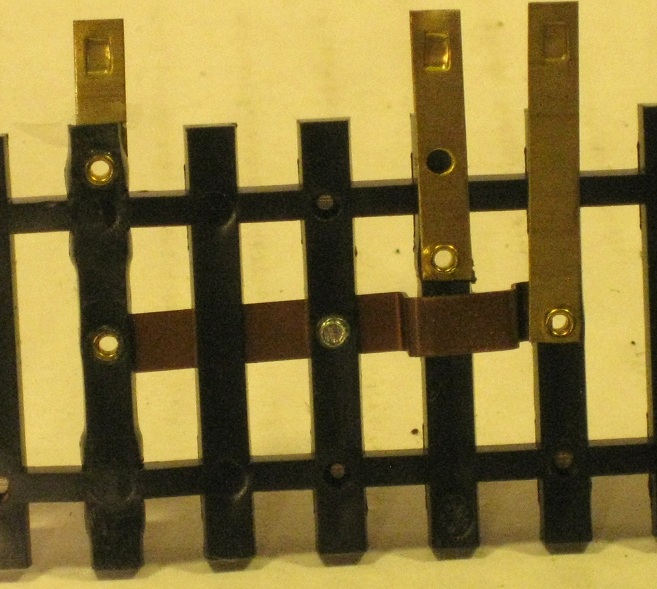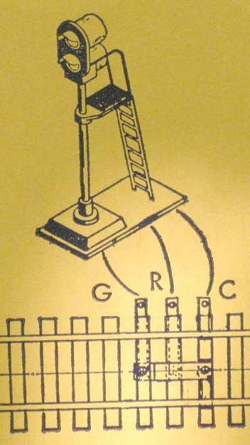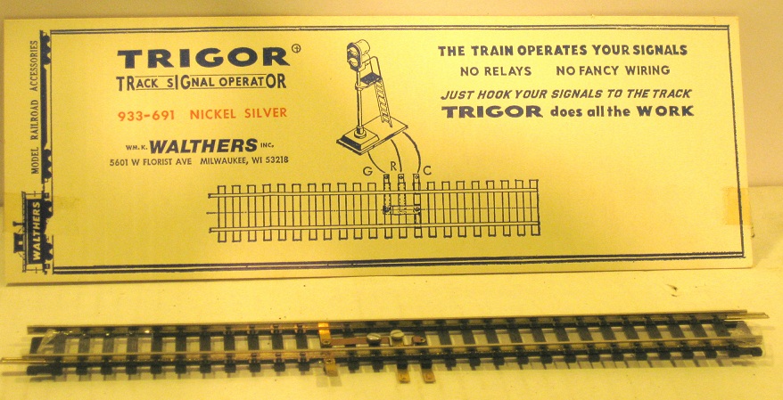 Here is my first contribution to the AOTW category, a Walthers "TRIGOR" track section to operate signals. I have yet to find installation instructions for this thing but from what I can gather upon close inspection it works just like Lionel's pressure trigger system. As a train passes over this track section it's weight causes the spring metal contact to break contact with the green light circuit and connect it to the red light circuit. Once the train clears the track section, the pressure is relieved on spring metal contact causing the green light circuit to be restored. The power for the signal's lights is drawn directly from track current.