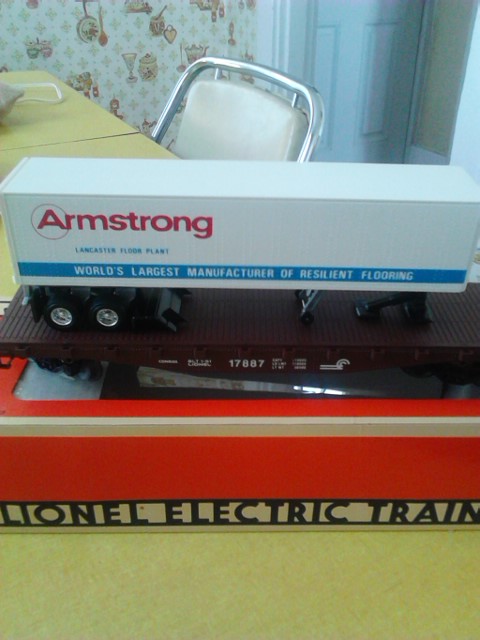 I just picked this up. Its a Lionel O guage conrail flatcar with an Armstrong trailer on the back. Made in 1991. Mint condition no track time. Since I work for Armstrong ive been buying up any thing in the train dept.