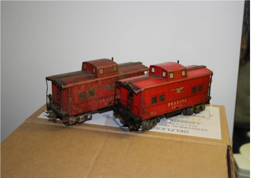 I found these two old Marx O gauge cabooses at an antique store today. I figured the rusty one looked so forlorn, that it needed a new home, and of course the other had to come along with it. $8 apiece (perhaps a little high, but trains are few and far between out here), a both should be excellent runners.