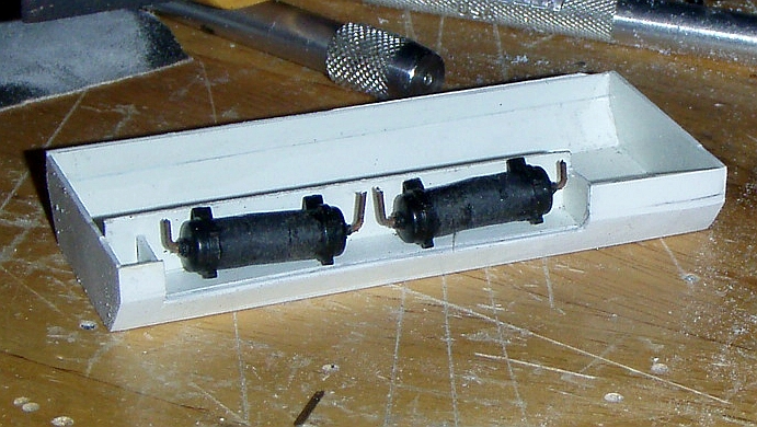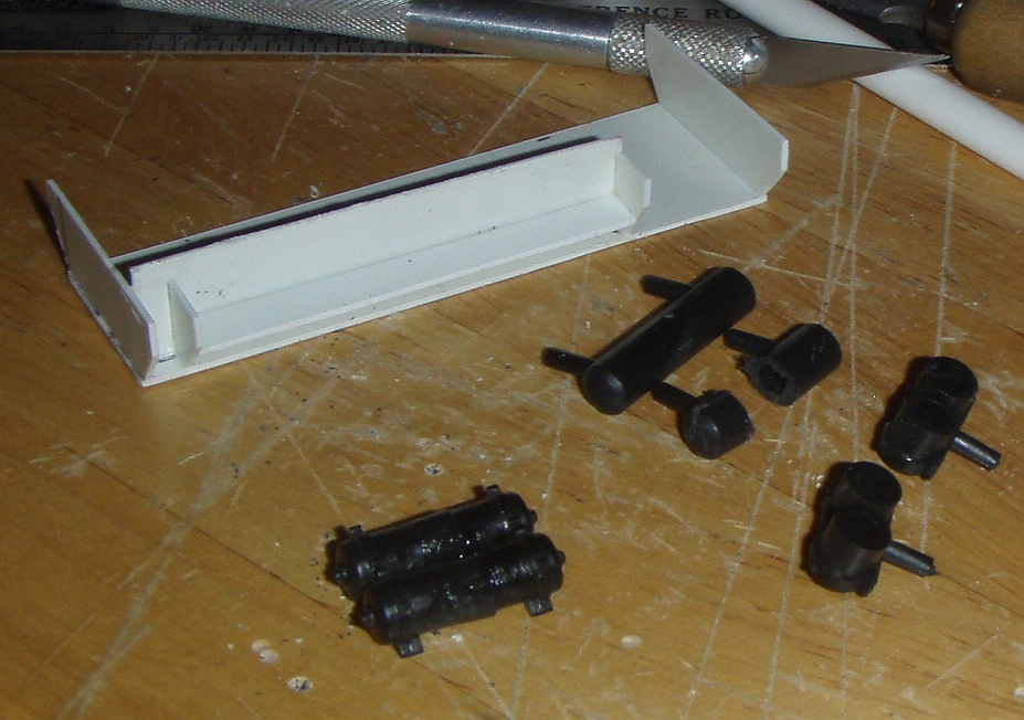 ...came with no fuel tank casting. These have a unique inset on one side with air tanks for the brakes in them. Since Bachmann wants $5 s/h for a $4 part, I set about bashing my own from a couple Athearn air tanks and sheet styrene...