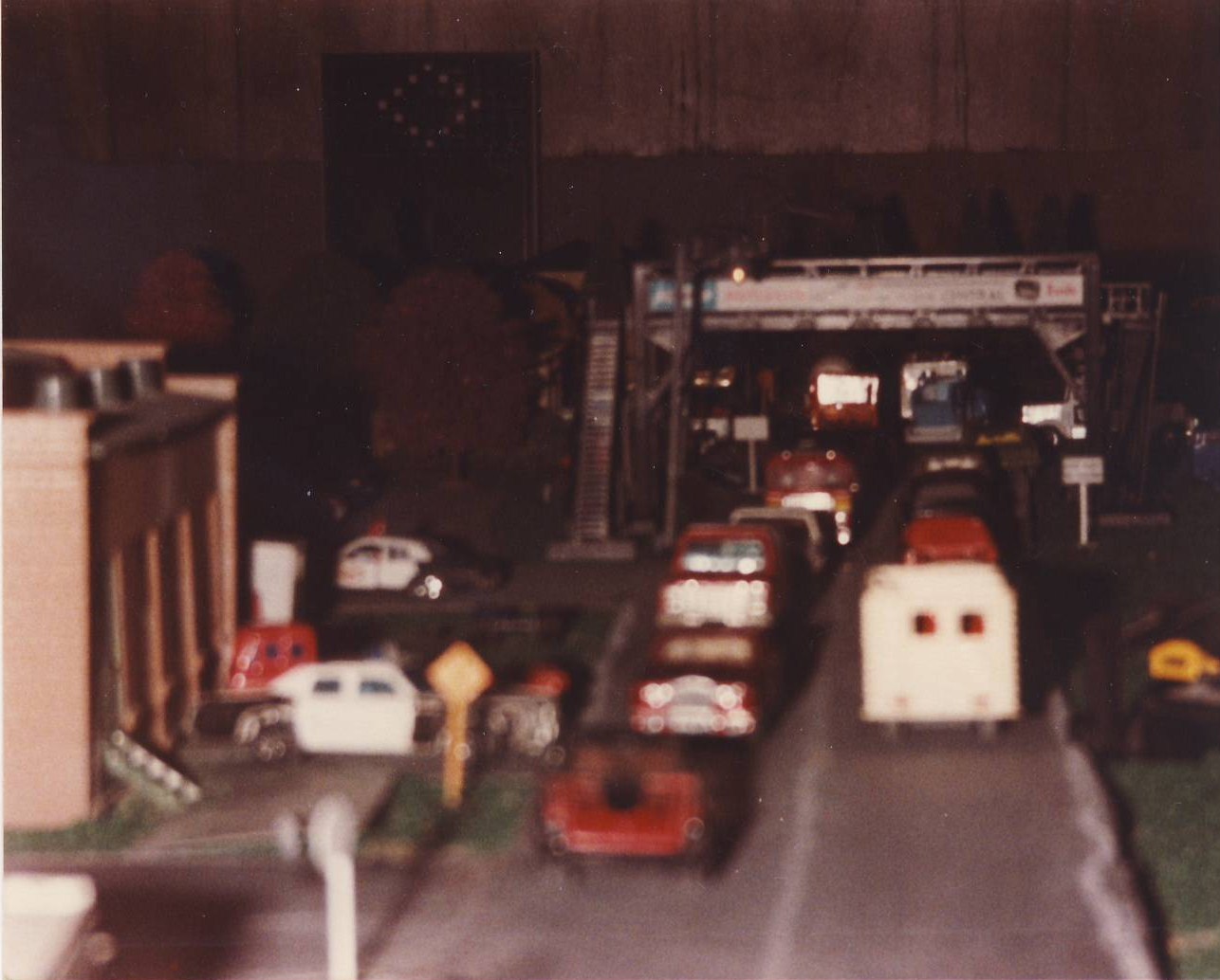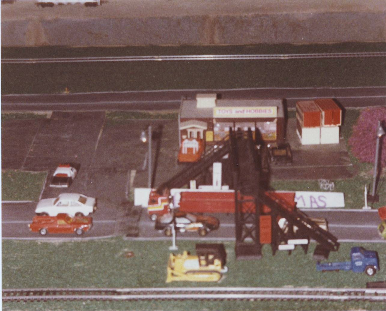 my main street scene 1984 - roads were made of black construction paper with chalk lines joined together with black electrical tape - that is a Bachmann snap together ped bridge