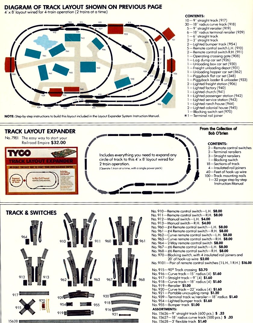 My first Tyco set was the Spirit of 76 over and under set. This was followed by my first real layout using the layout expander. It was a cool track plan for a 12 year old kid. I had lots of fun with that layout. I bought the expander and used the components included, i.e. track and switches. I added most of the items they had listed, all of the operating accessories, my building differed some. It took a lot of news paper deliveries to complete the layout way back when. All great memories.