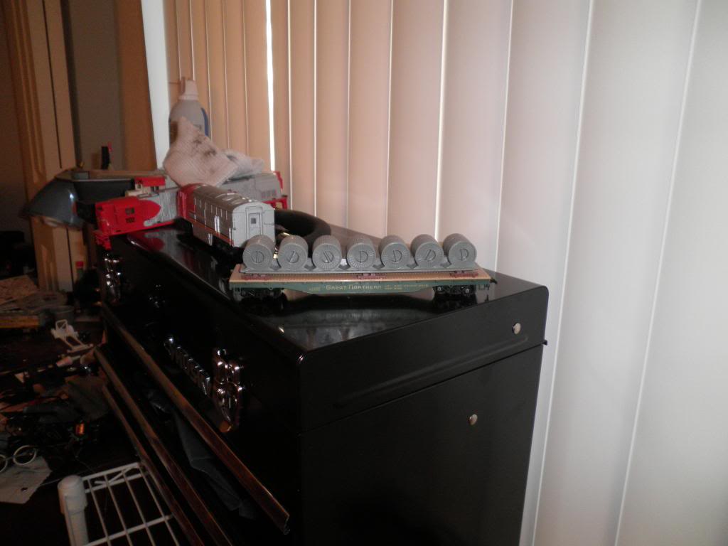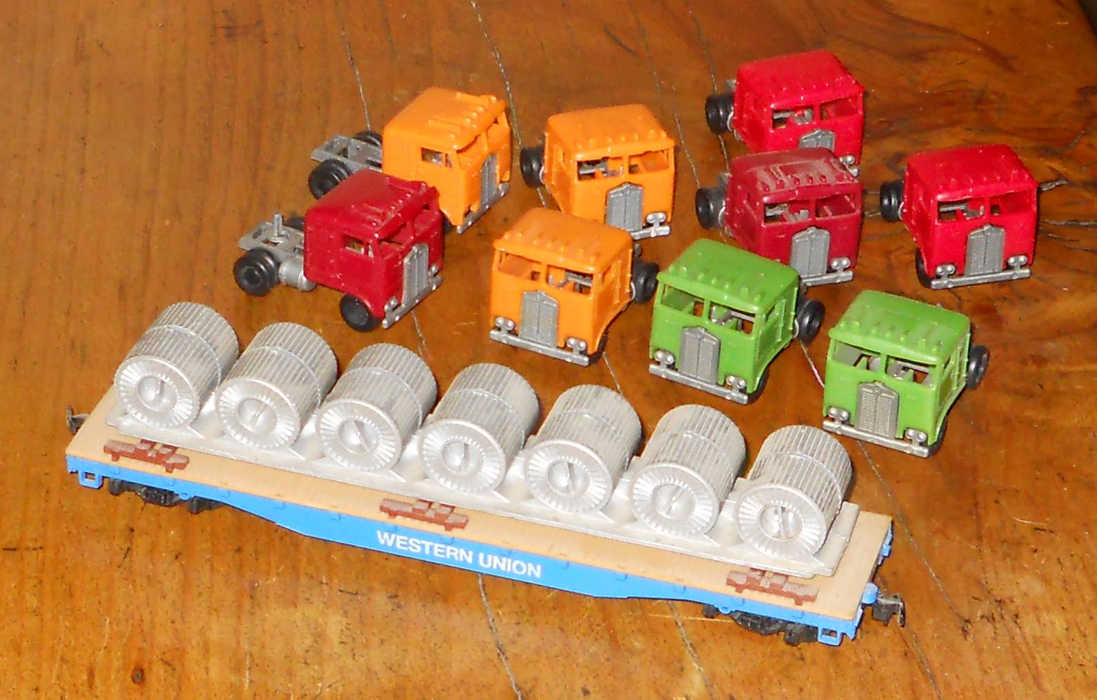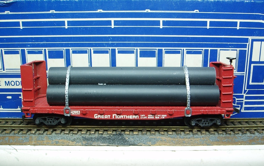 * Bachmann bulkhead flat car with a pipe load. A very light car to run . I have one with metal strips inside a few pipes. It works.