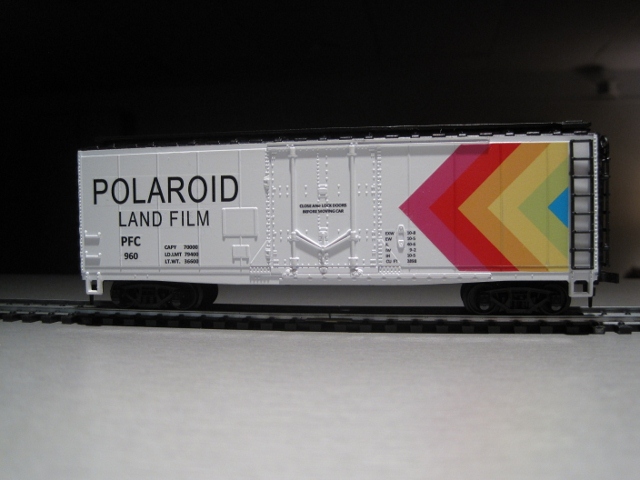 Here's AHM's classic Polaroid Land Film boxcar, but with decals in place of the card stock Polaroid logo and the tampo-applied text: