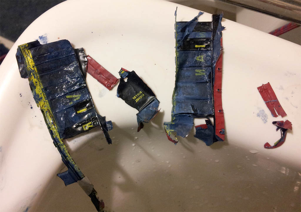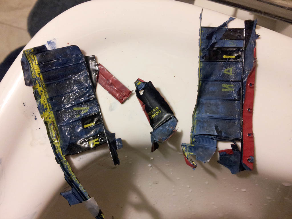 Still, it's pretty neat that paint can peel off that way. After 18+ hours in the bath, the underlying blue came off as well. Oops.