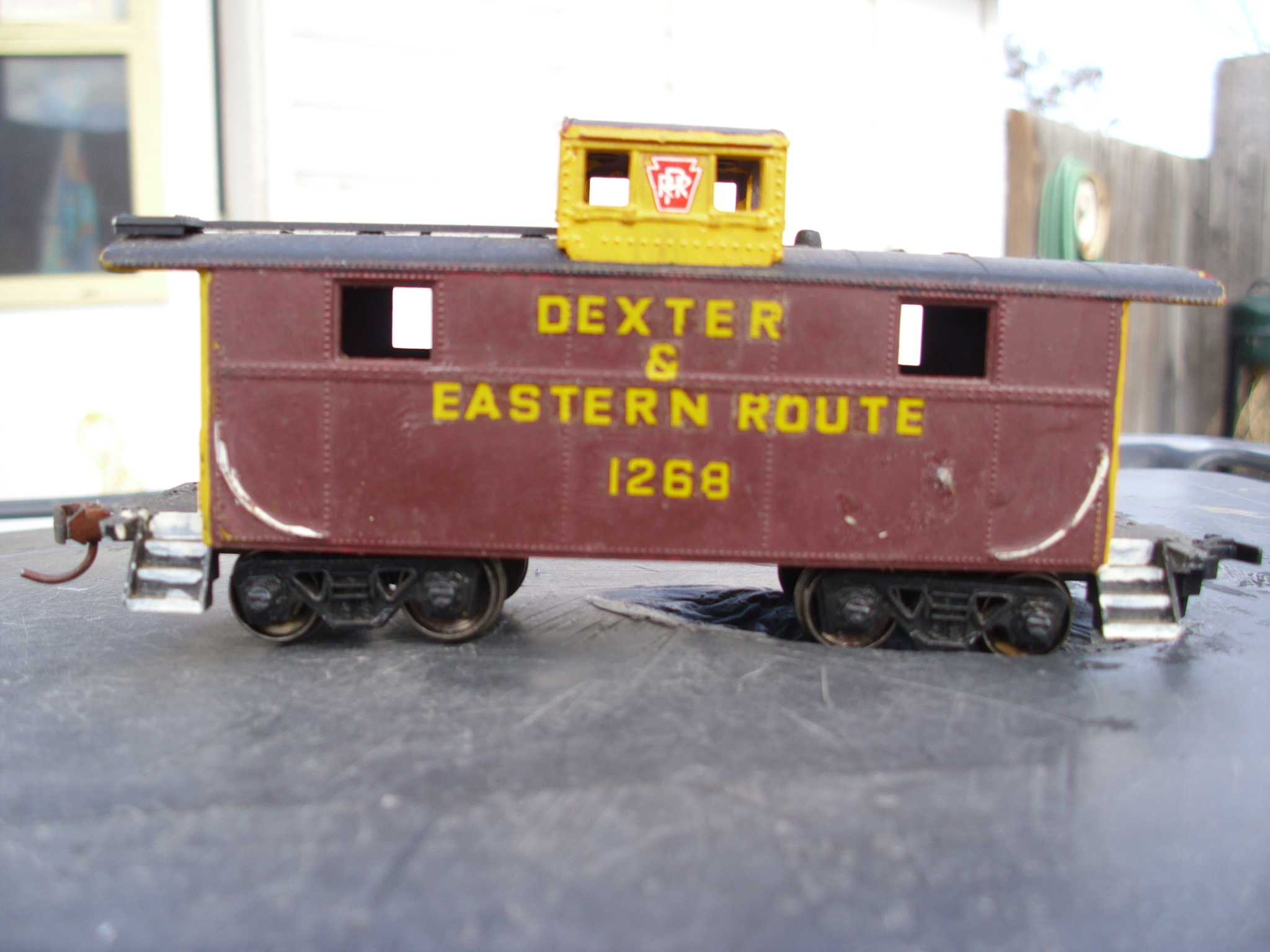 Old diecast Gilbert cabeese are easily recognizable by the one piece end railings & ladders and straight smokejack, and a giant bulb socket in the center of the floor on illuminated versions. The early ones were really crude.
