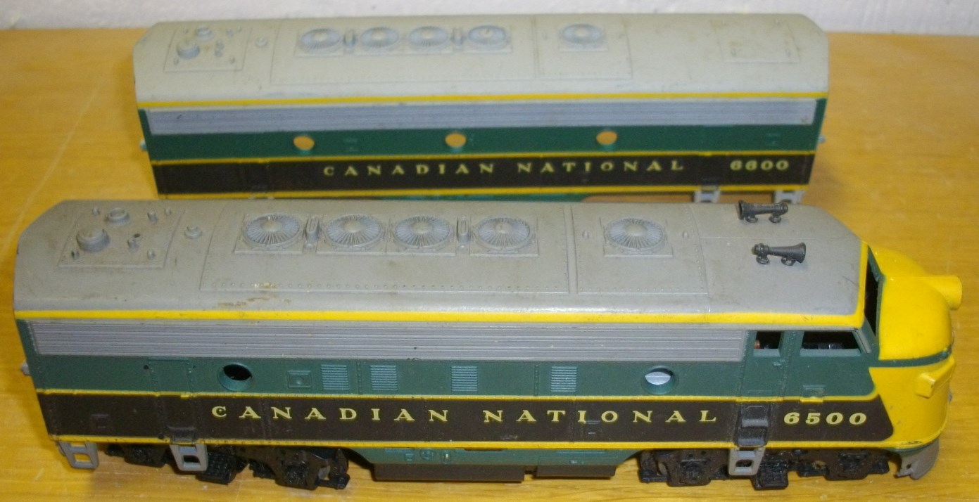 These are a pair of F7 Athearn Blue-box locomotives, which I got for $10 at the Amherst show. I really just wanted the A for its drive mechanism, but the shell is nice, and the seller threw in the B shell with it. The B has no chasis, but I could use a rubber-band drive chasis as a dummy for it, or maybe I"ll raid the flea market when the weather gets better.