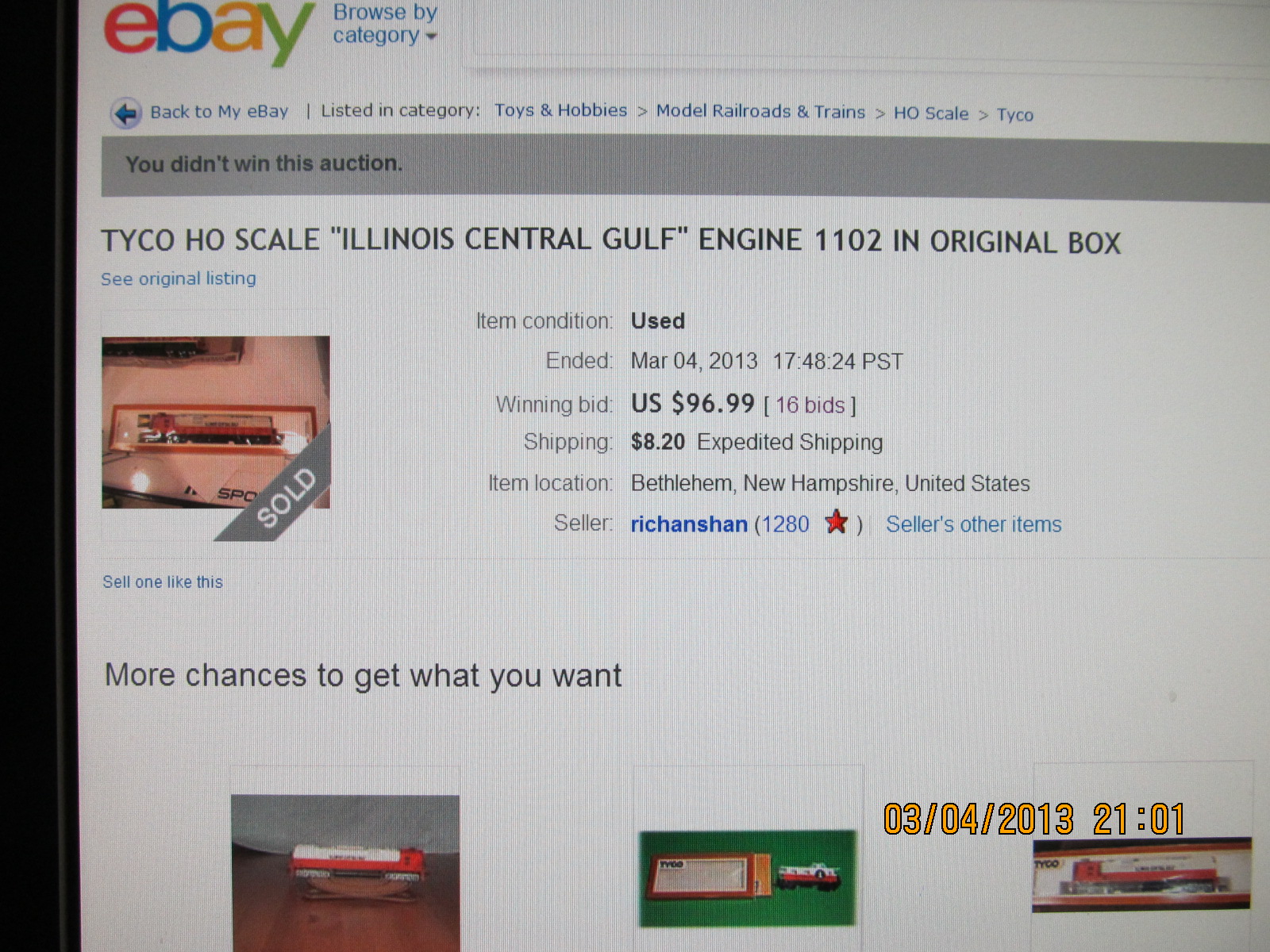 | I have had bad luck on Ebay with both HO and N scale stuff. I would bid early (like 6 days before the end) and I would be the high bidder up until literally 5 seconds before it ends and someone snipes me. I generally only do buy it nows (because sometimes they are actually cheaper). I only bid if it is something I really really want that I can't find at shows, etc. Even then I don't bid until the last moment. I have noticed that even tyco parts units go for pretty decent money now though! Even the rolling stock prices are up.