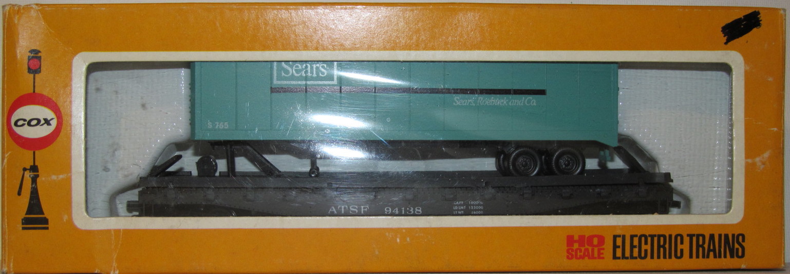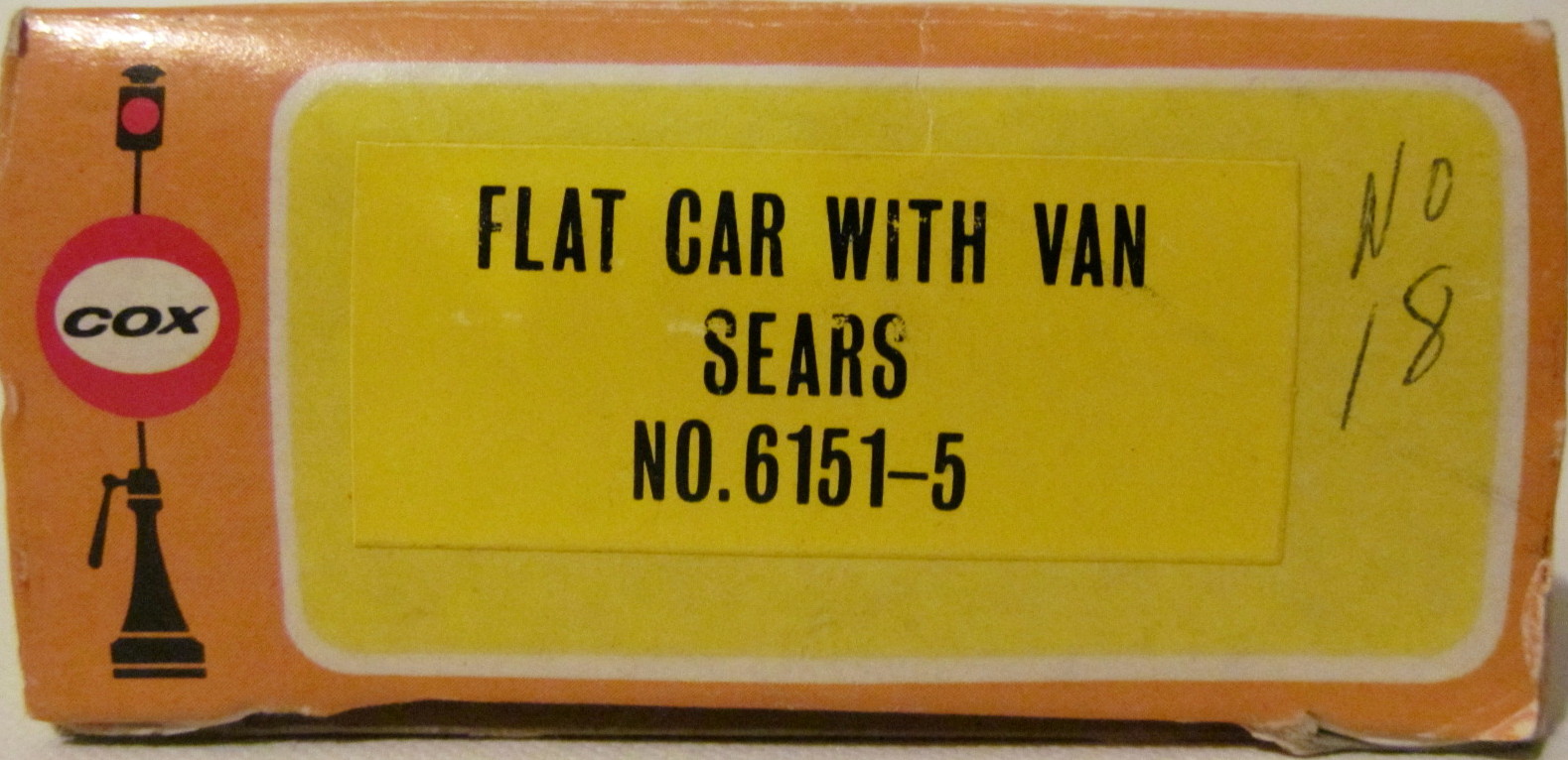 New in the box - Cox Sears Ho trailer on flat car -#6151-5 - Very hard to find with box - this one is mint - I was very happy to come across this - It is like Christmas morning for me finding this with the stock number as info on Cox seems to be limited. The interest in my recent YouTube video on these is also gaining interest as i get questions daily on them and the Lionel Sears boxcar by Athearn. I believe the Cox HO flats were done by Athearn as these flat cars by Cox and Athearn look just alike.