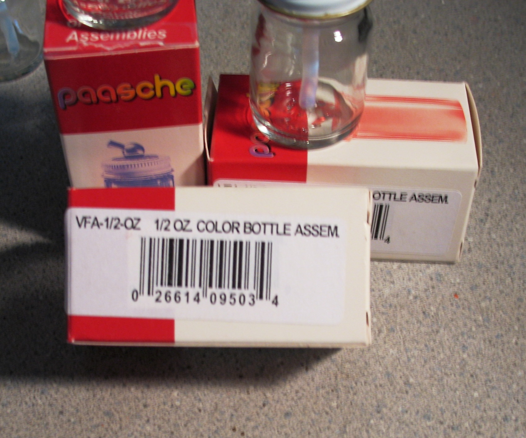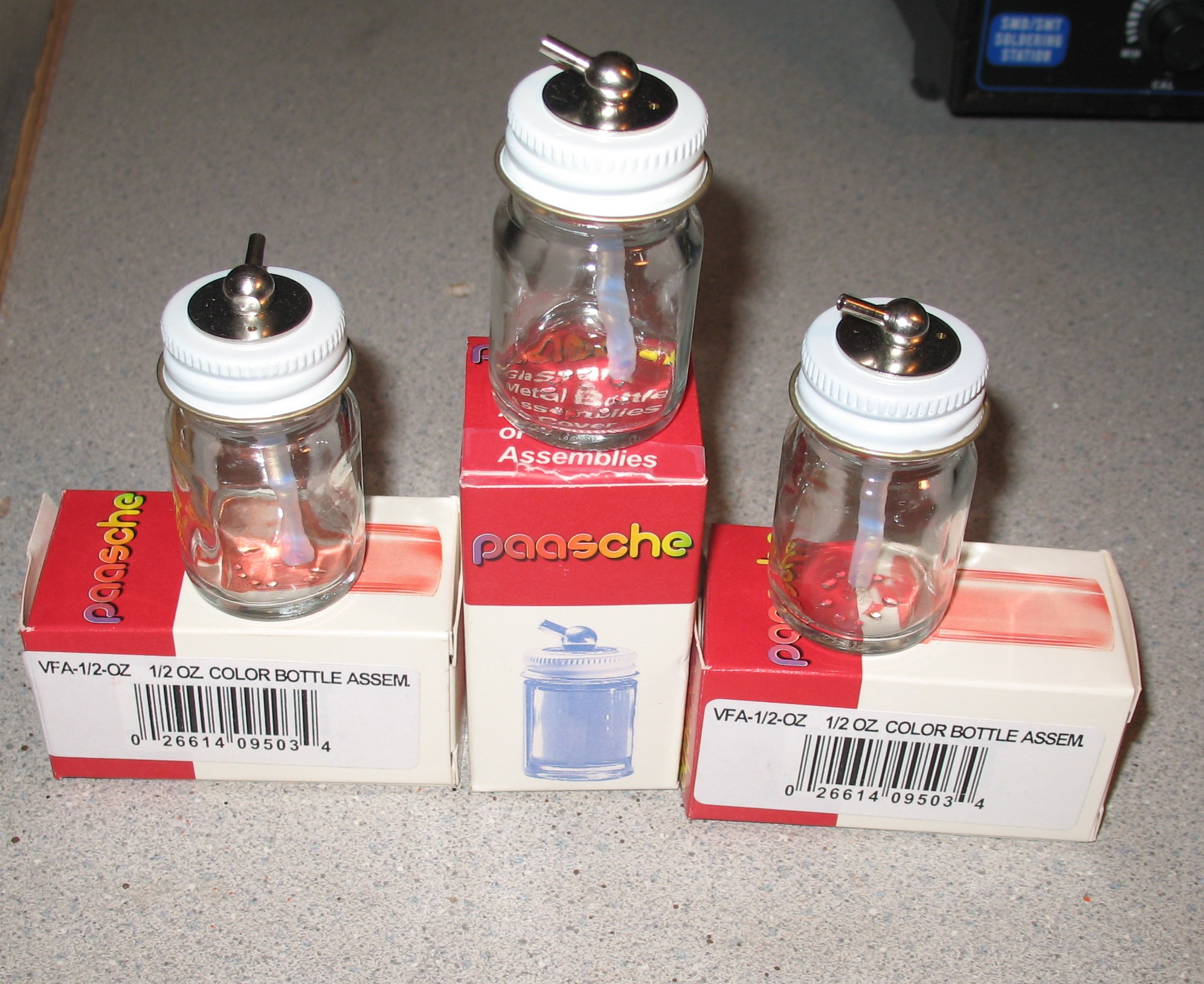 Today I was cleaning my paint booth and stuff, and I came across several new paint bottles that do not fit my Paasche airbrush. These are for the Model V airbrush, which has a narrower opening on the cap fitting than mine (I have a VL-1008) so they are useless to me. Before I screw around with Craigs List locally, I though that one of the Tyco gang might need them.