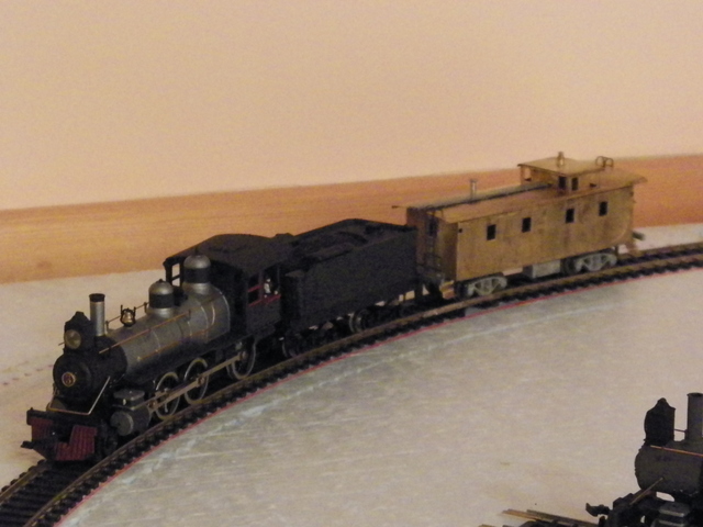 Thanks for the info on the kadee 26's and the hook and loop term. Yeah, I just got back into this a few months ago and I'm realizing I need a whole different set of tools. The brass don't look too bad. You can really see it wasn't much compared to some of the brass cabooses they make these days. Although, I like the history; thinking that it's like at least 50 years old. hoseeker dot net has them in some of the catalogs in their literature; maybe shaygetz knows? I didn't get the dents out as well as I would have liked to, but I did get to watch it be pulled around by my Tyco-Mantua Rogers 4-6-0. And I'm glad I took pictures of it before I messed with it. I think there is something to be said about just leaving antique pieces alone and not messing with them. Anyway, here's a couple of photos.