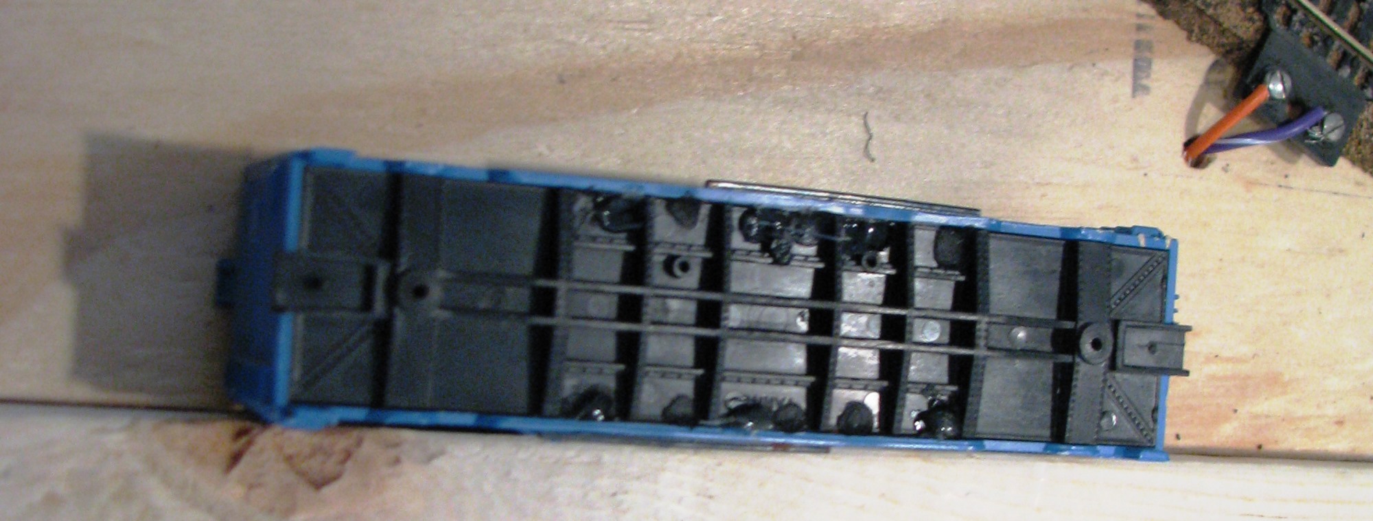 quote:Here is the bottom of the car. I do not have the pieces that hold the couplers on and also, one of the pins for the coupler is broken off.