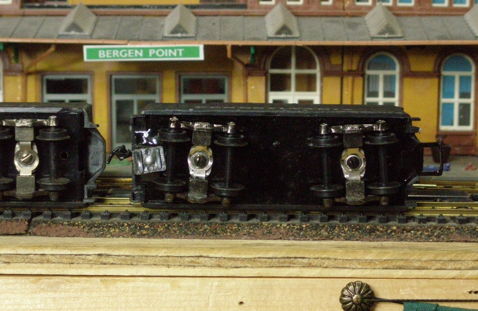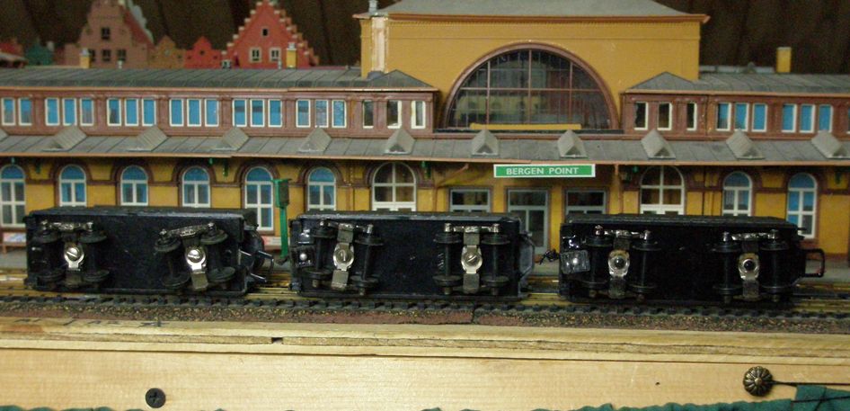Sakai tenders for 2-6-2 and 4-6-4 locomotives they made under their own name and the Champ name. They also made the Gilbert type cars after Gilbert was gone. On the tender bottom of the center and the one on the right can be seen Gilbert style coupler covers. Standard on Sakai cars. frank