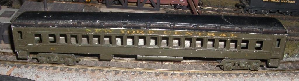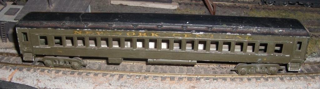 Appears to be all original, die cast thick Zamac or Aluminum - body seems to be one piece, frame and all. Long shank dummy knuckle couplers. Trucks look original as well. No names marked anywhere on it. Somewhat resembles an Erie Stillwell or other low roof clerestory coach. I'd guess it's prewar, but it's not Flyer or Lionel.