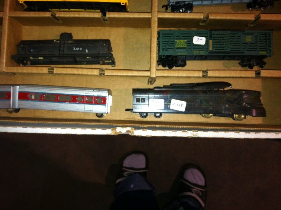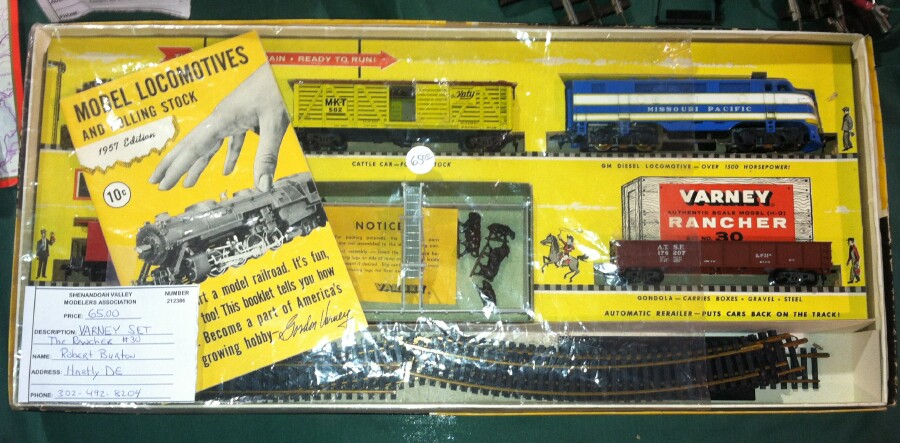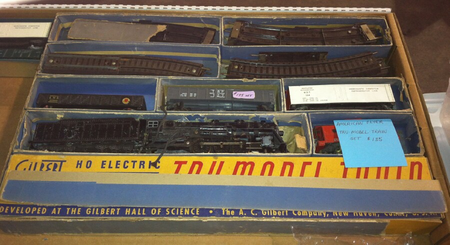 - Mantua Aero train, 1 unpainted swirly-shelled engine and 3 cars, $125. -Varney train set, complete with box. - Marx Rock Island HO set, complete with box.