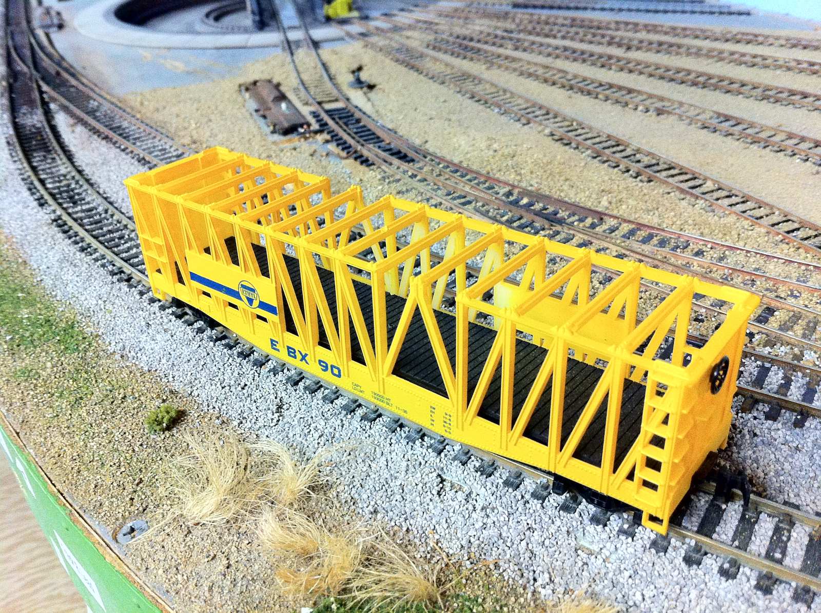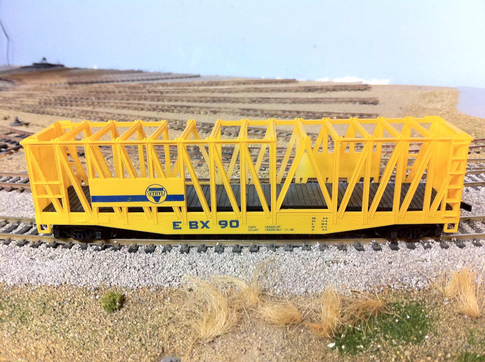 Ethyl Corporation, EBX reporting marks.......yeah, you could put anything IN that car. Hogs, too, probably. http://www.matts-place.com/intermodal/part2/images/tanks/eidu0000717.jpg http://www.matts-place.com/intermodal/part2/images/tanks/etnu1500093.jpg http://www.matts-place.com/intermodal/part2/images/tanks/aocu0308751.jpg http://www.matts-place.com/intermodal/part2/images/tanks/secs1221120.jpg Since the AHM cars shown is "vintage", before containers, I would bet that's how they did it, load loose vessels inside it like the first photo. Nowadays, as you can see, they are drop-in to trailers or container train flats...or ships. Since the model did not come with appropriate loads, well, just tell folks when they went to containerization, they "re-purposed" the car! Dave