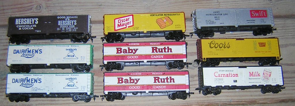 More reefers. I think that most are Tyco, absolutely no identification on the bottom, except the two on the right column, bottom two, which are Athearn. Dave