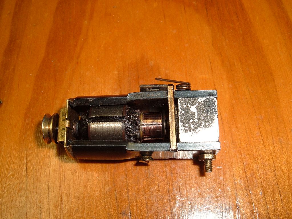This is the motor from my Penn Line D1 Midget with a rebuilt commutator. It exploded on the first test run (the Midget was given to me in pieces), and I had to scour the room for all 5 segments. It was clearly subject to severe overheating, and the fiber disk against the windings was cooked. I tied the segments together with a loop of thread on the winding end, then sealed everything with CA, which also stabilized the cooked winding insulation. It runs well, but it has a balance issue that causes annoying vibration against the shell.
