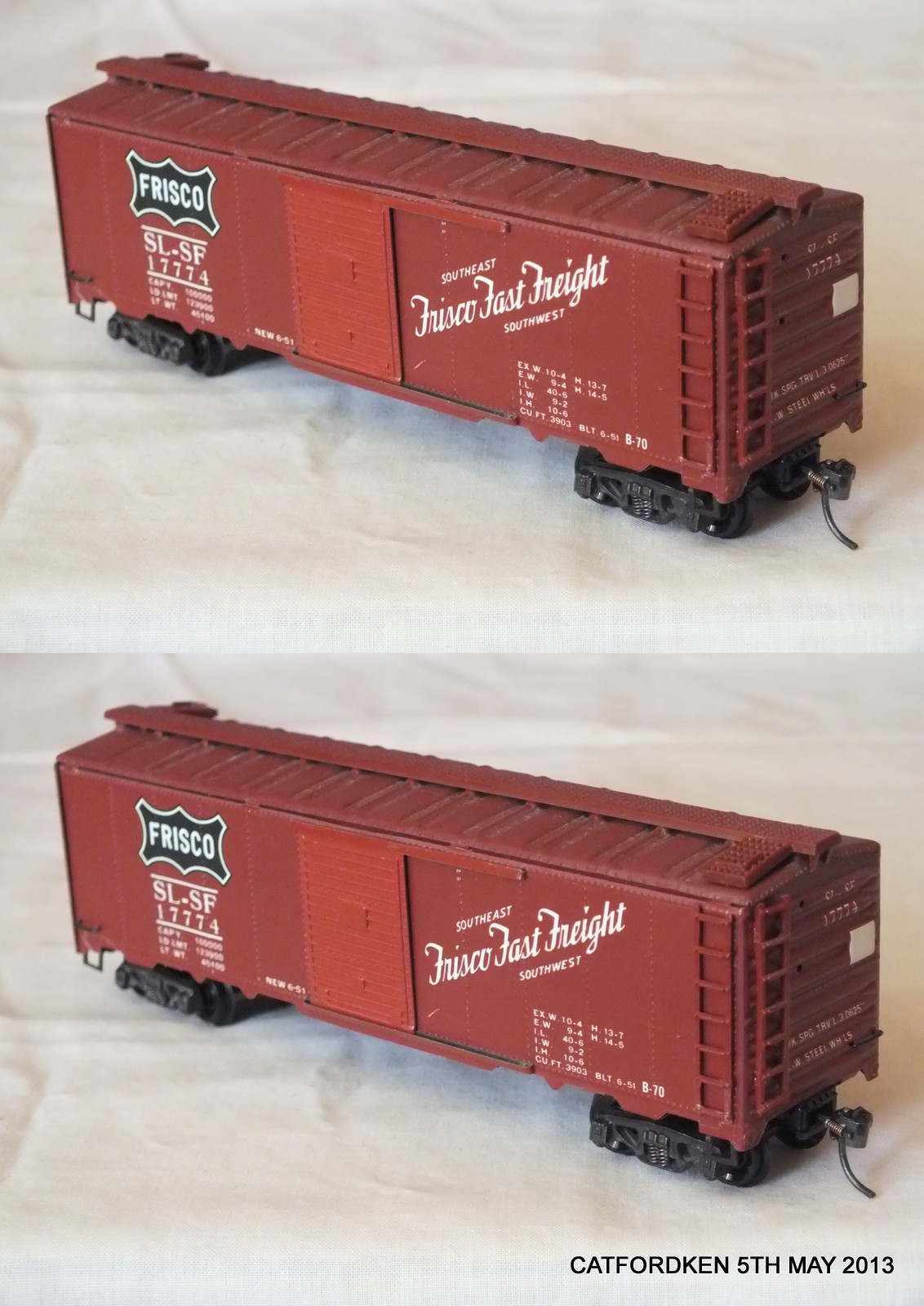 The Frisco car is an old Varney car - the thick roofwalk, as well as the shape of the trucks, is a tipoff. Bowser re-issued them for a while so it might be a Bowser.