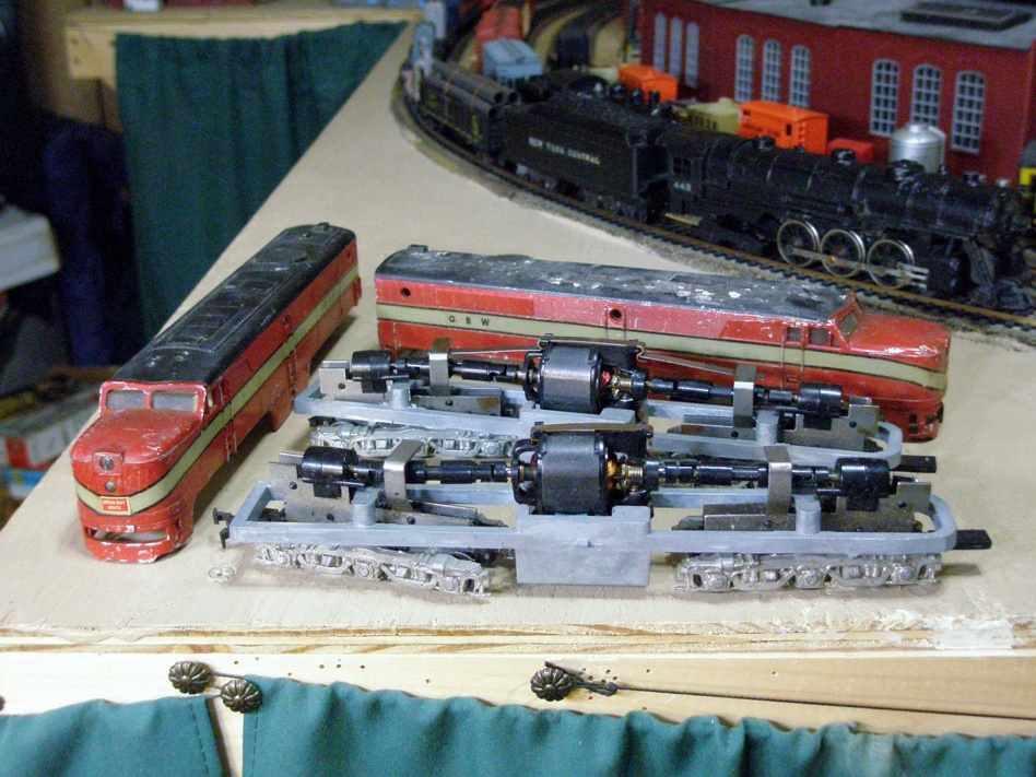 Opps ! I forgot to post a loco of the week, in Loco of the week. This week I'll post a pair of Athearn Alco PAs. Greenbay Western Railway. Recently acquired from Railspec. Not seen to much around New York City. I don't think they are a stock Athearn paint scheme. They are of a first run type with metal side frames and a old style open truck frame. Only the bottom is covered. The drive has the black motor and NO flywheels. They run very well. edit; added a photo showing the drives. frank